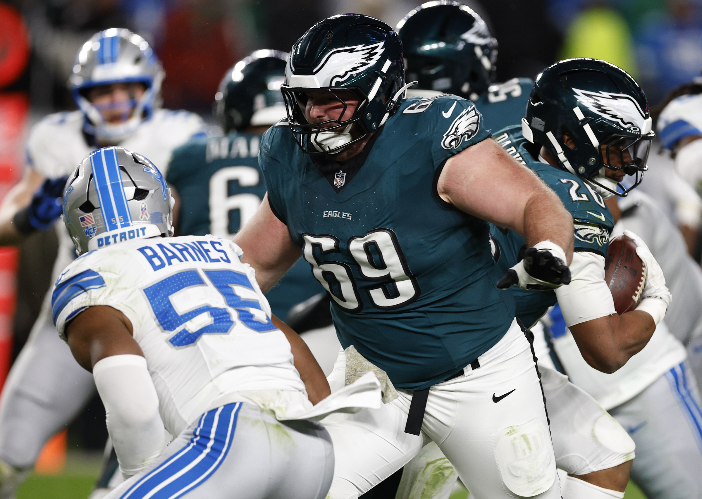 Eagles guard Landon Dickerson blocks Detroit Lions linebacker Derrick Barnes.