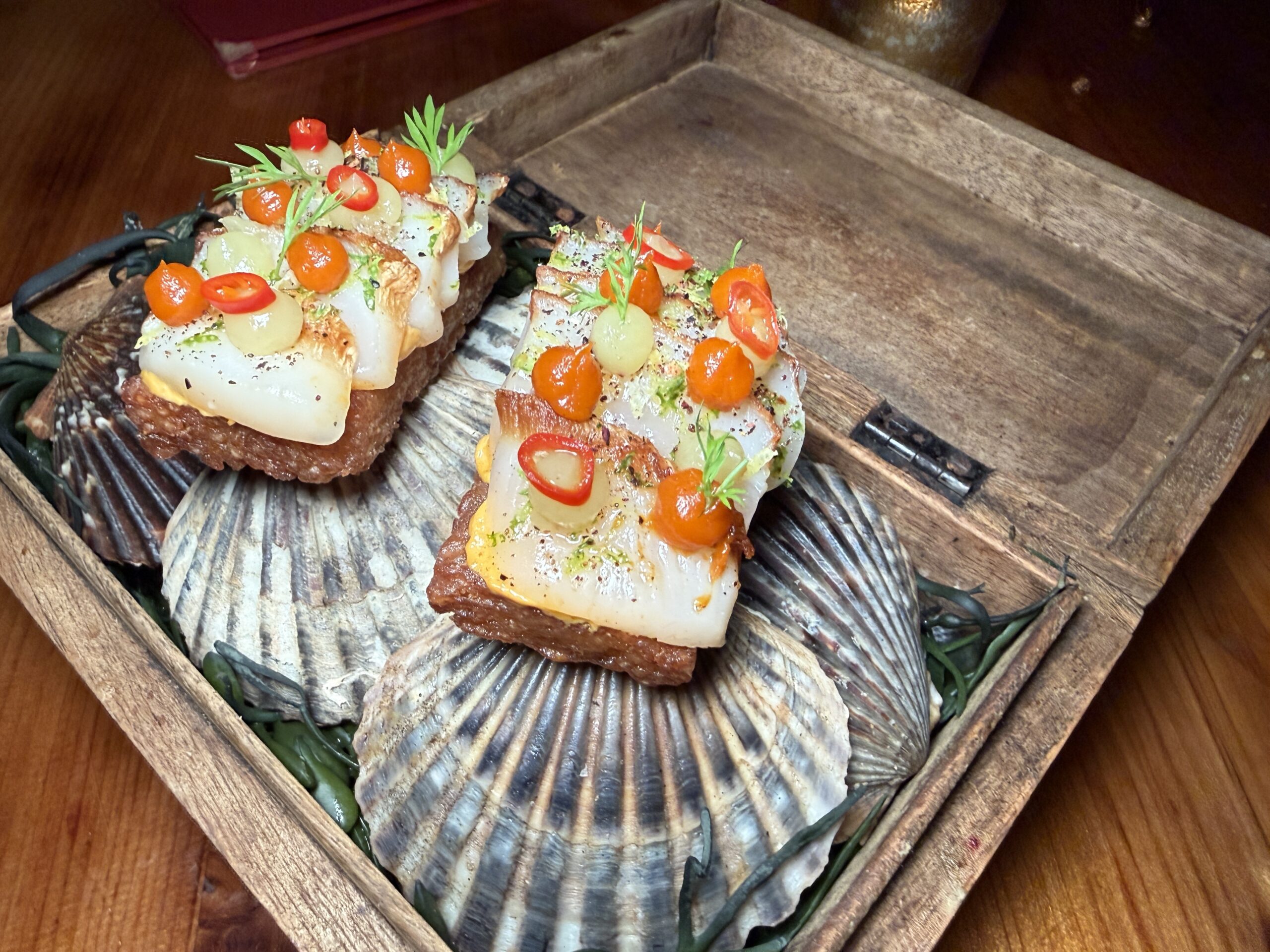 Hokkaido scallops on crispy rice with vadouvan curry at Bardea, served on shells inside a box.