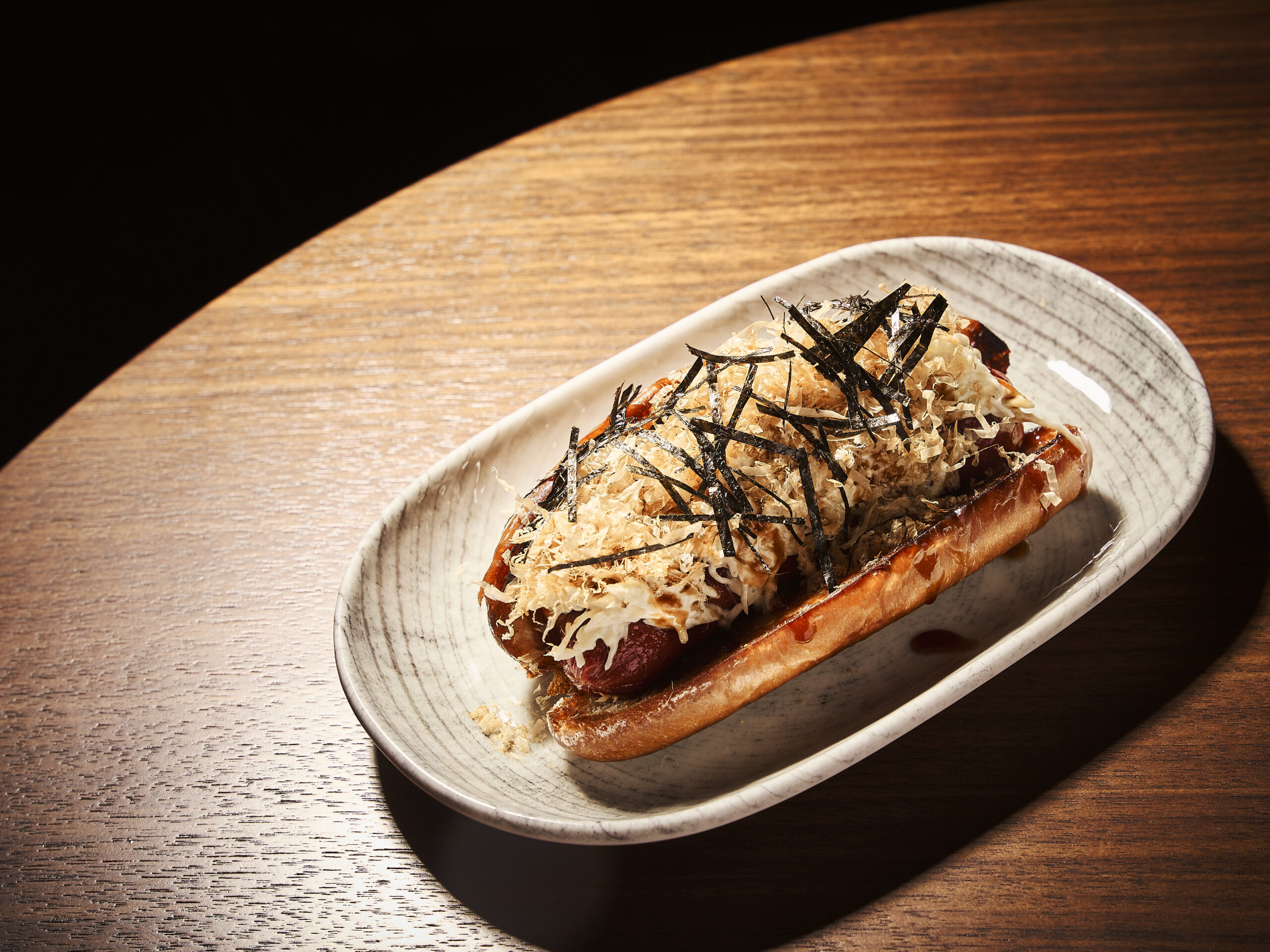 The Wagyu hot dog at Almanac in Old City, topped with tonkatsu sauce, Japanese slaw, bonito flakes, and nori.
