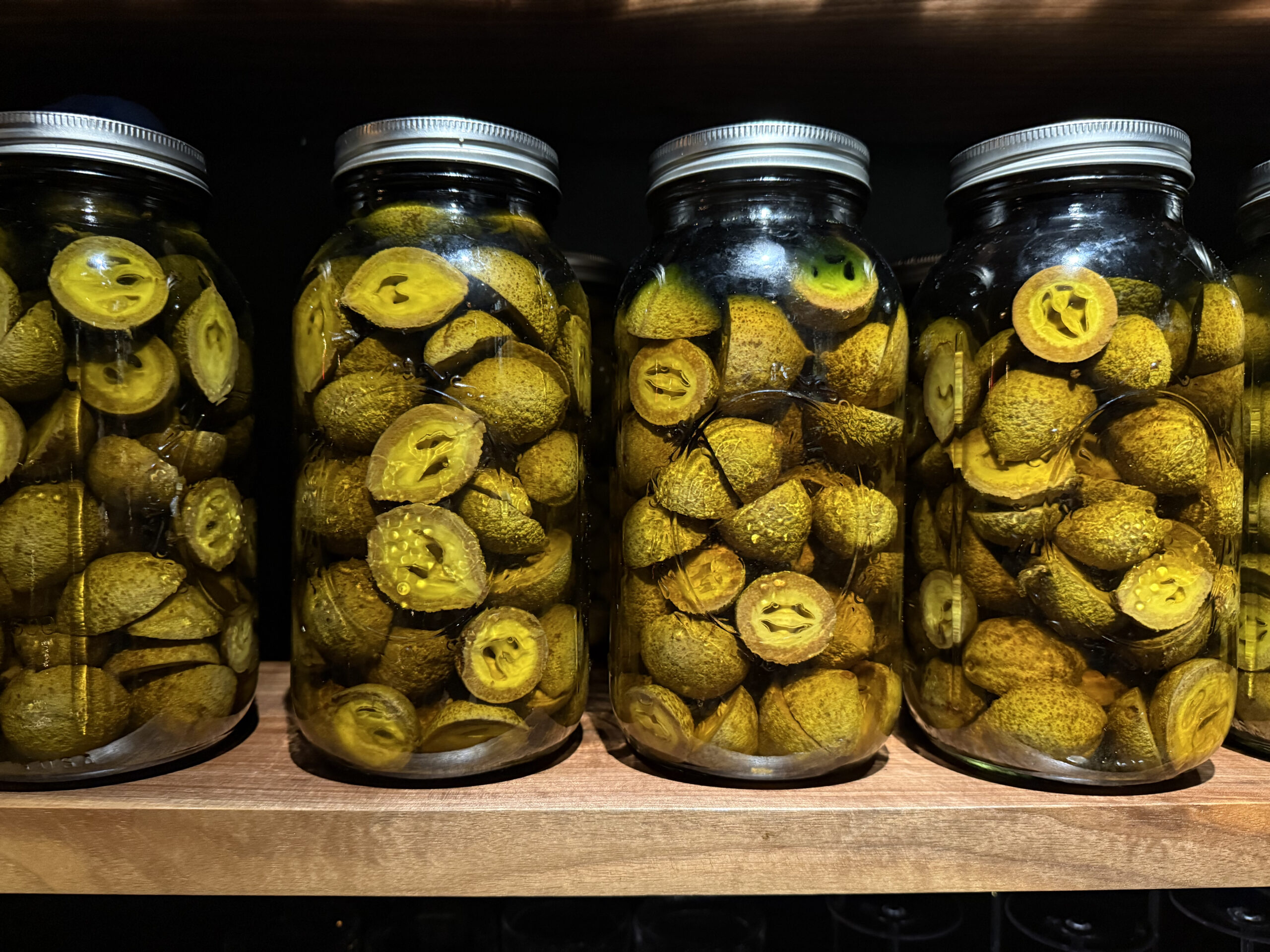 The nocino currently sitting on Almanac’s shelves were started on June 24, when their team harvested the nuts in Merchantville with Danny Childs, sliced them in half, put them all into 2-liter mason jars, and covered them with Everclear, a neutral grain spirit. They steeped until Thanksgiving, when the nocino was tempered with water and sweetened with Demerara sugar.