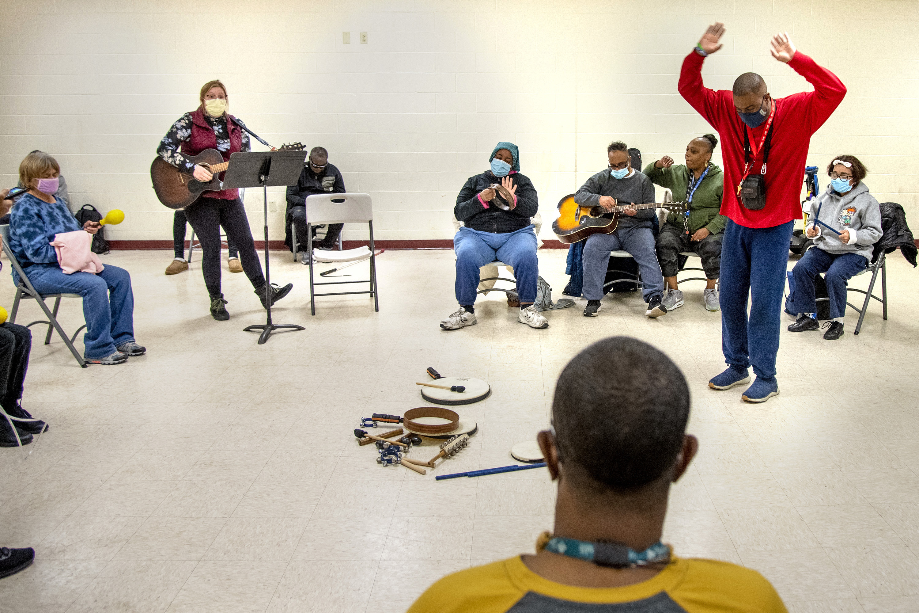Sadiki Smith (right) stands to dance as music therapist Madison Frank (left) with her guitar leads a music therapy session at Gustine Recreation Center Tuesday, November 29, 2022. Since the closing of the Carousel House, the city’s only rec center for people with physical and intellectual disabilities, many of the programs have moved to Gustine.