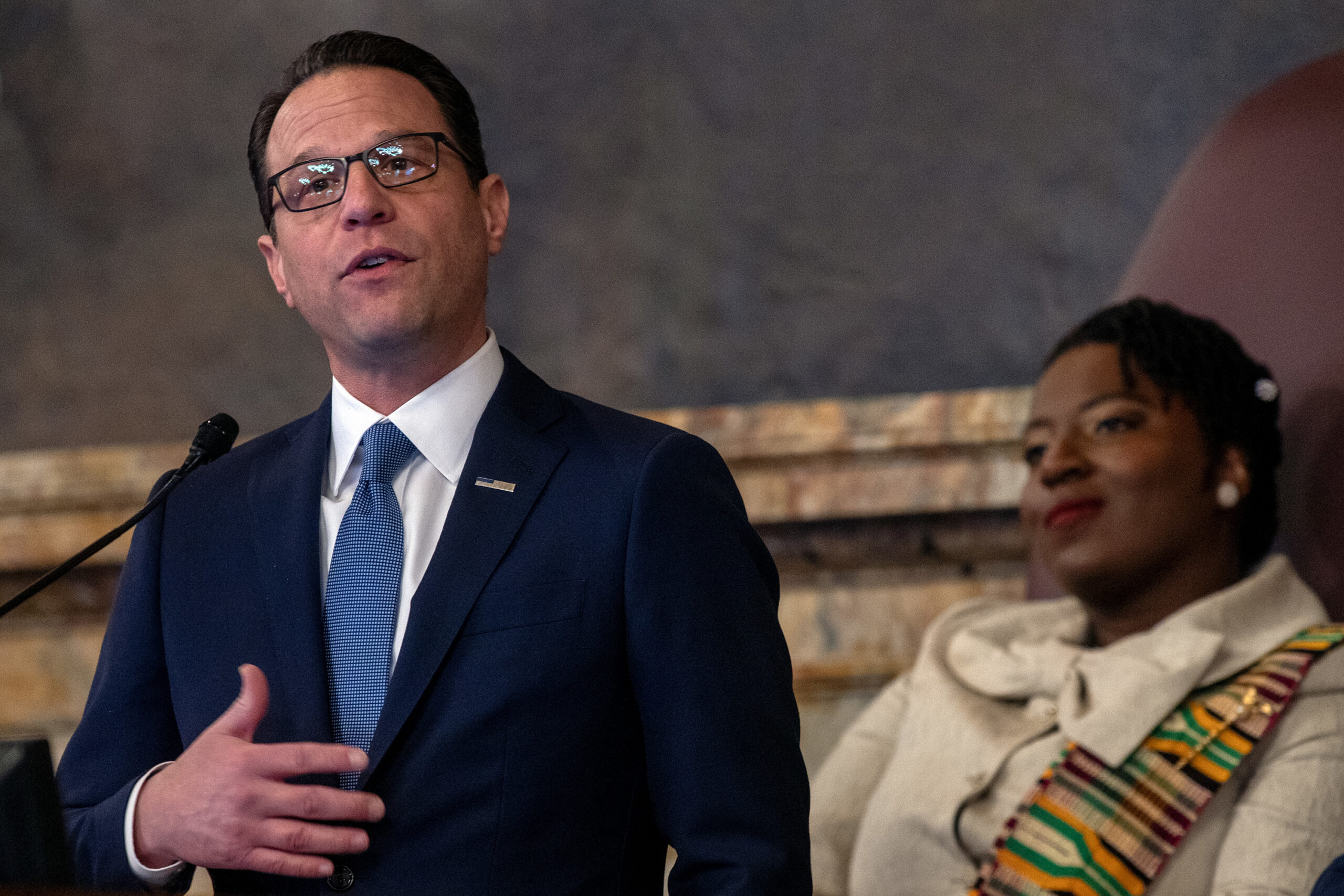 Then-Attorney General Josh Shapiro speaks at a news conference in the state Capitol in 2018 about legislation to respond to a landmark grand jury report accusing hundreds of priests of sexually abusing children over decades stalled in the legislature.