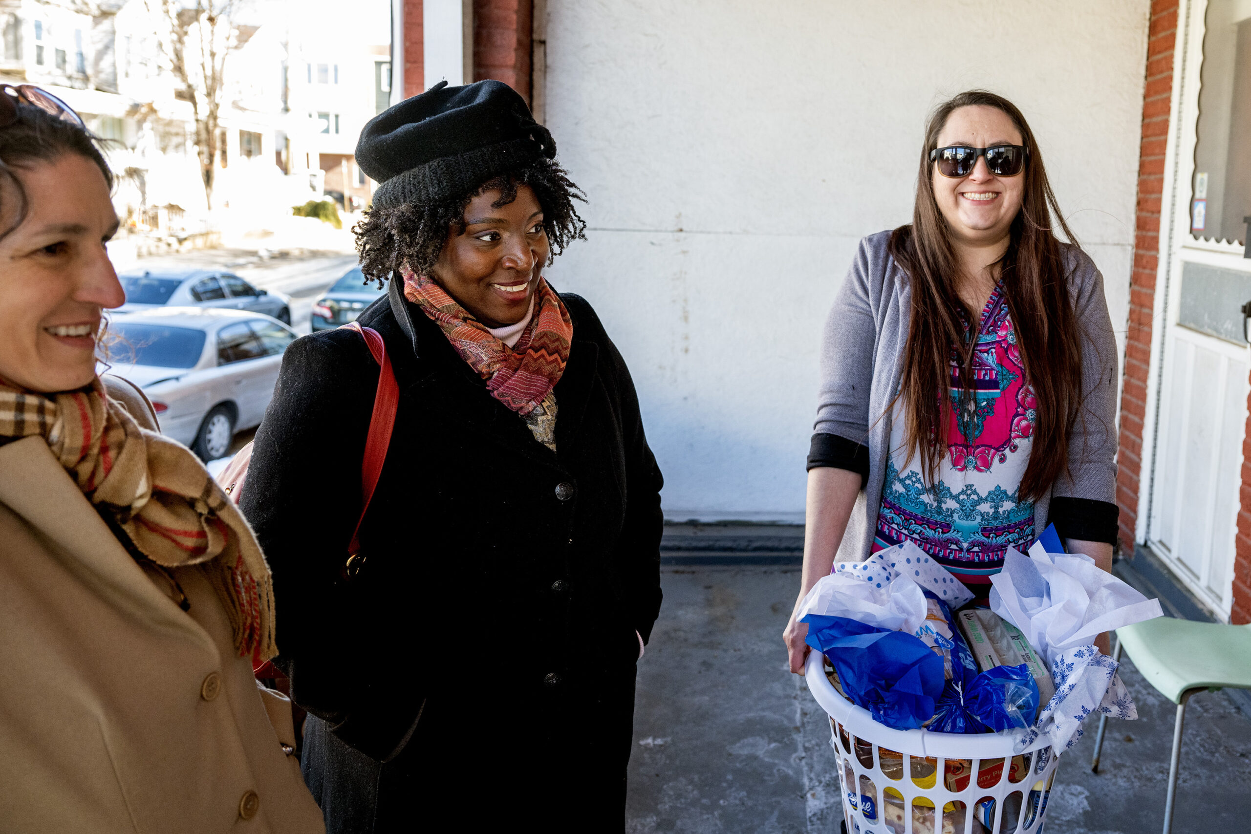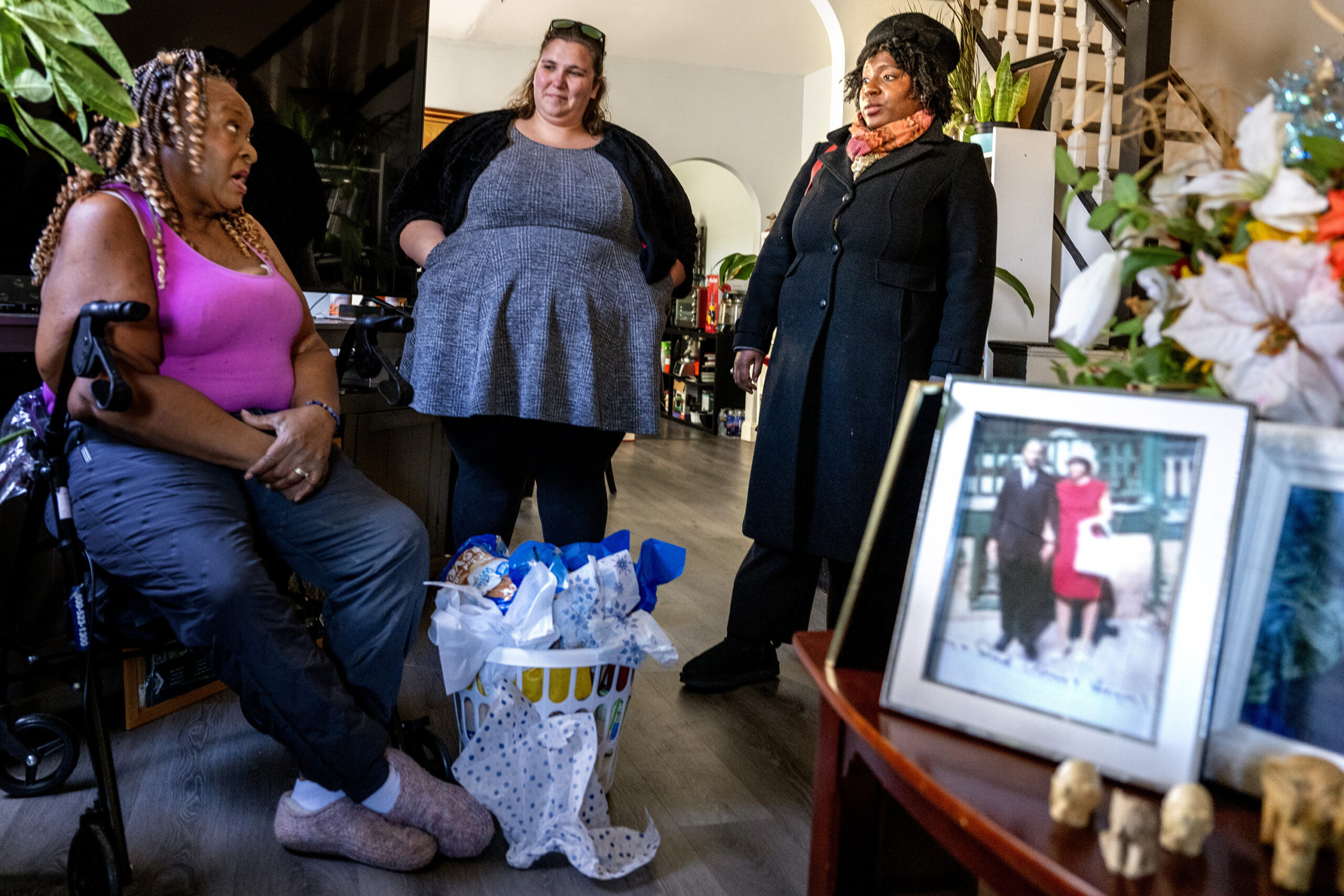 House Speaker Joanna McClinton (center) with her staff member Nicole Reigelman (left) and home care worker Kate McNaughton (right) wait to meet with home care recipient Ronda Gay on Jan. 20 in her West Philadelphia home. McNaughton was bringing a basket of milk, eggs, canned foods, and other necessities.