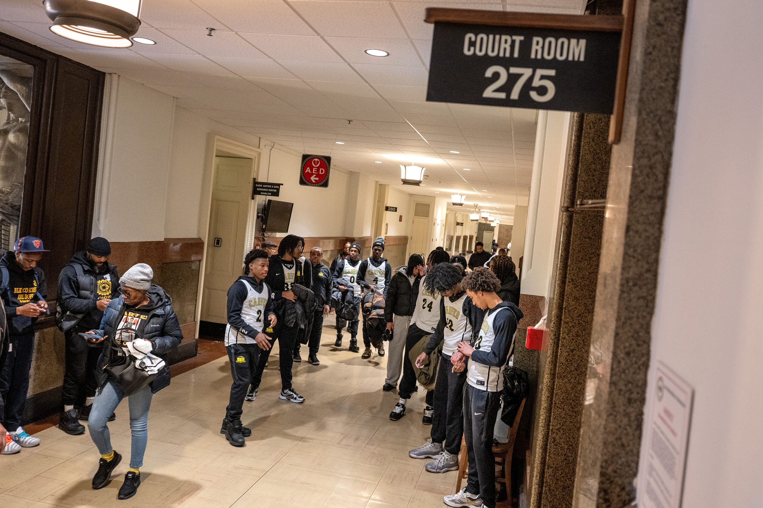 Carver Engineering and Science High School players and coaches wait outside courtroom 275 on Tuesday.
