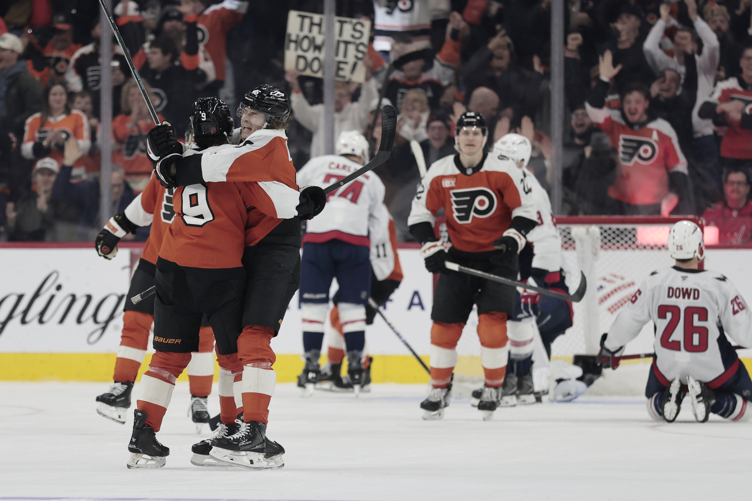 Flyers defenseman Jamie Drysdale (9) scored the game-winner with just over five minutes left against the Washington Capitals.