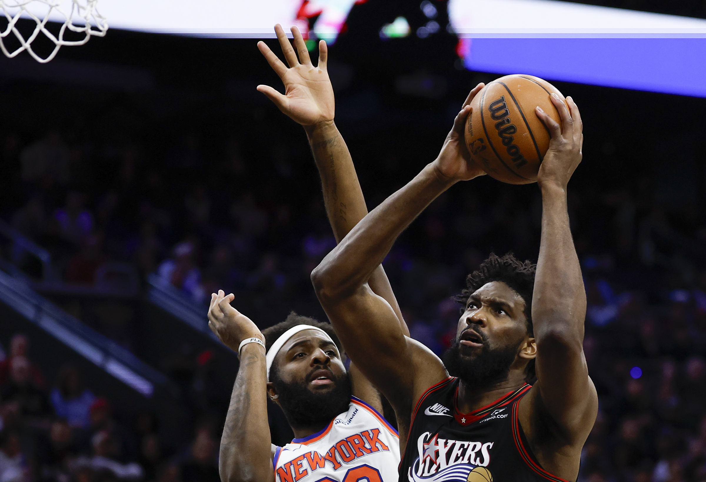 Mitchell Robinson (left) proved to be a thorn in Joel Embiid and the Sixers’ side for most of the game on Saturday.