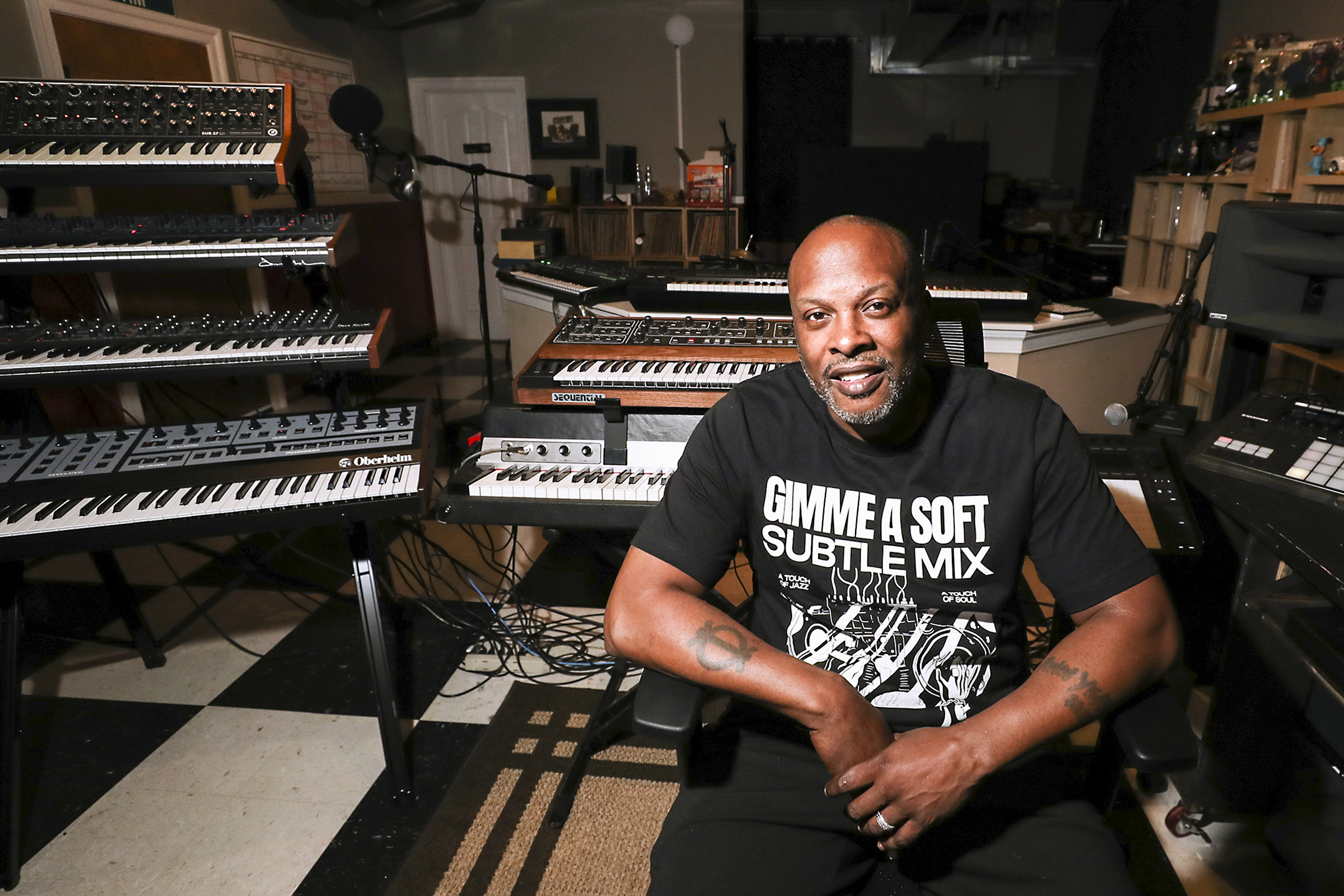 Jeffrey Allen Townes, better known as DJ Jazzy Jeff, poses for a photo in the recording studio section of his home in Bear, Del. in 2023. He’ll perform on New Year’s Eve on the Ben Franklin Parkway as part of the free concert and fireworks dispaly.