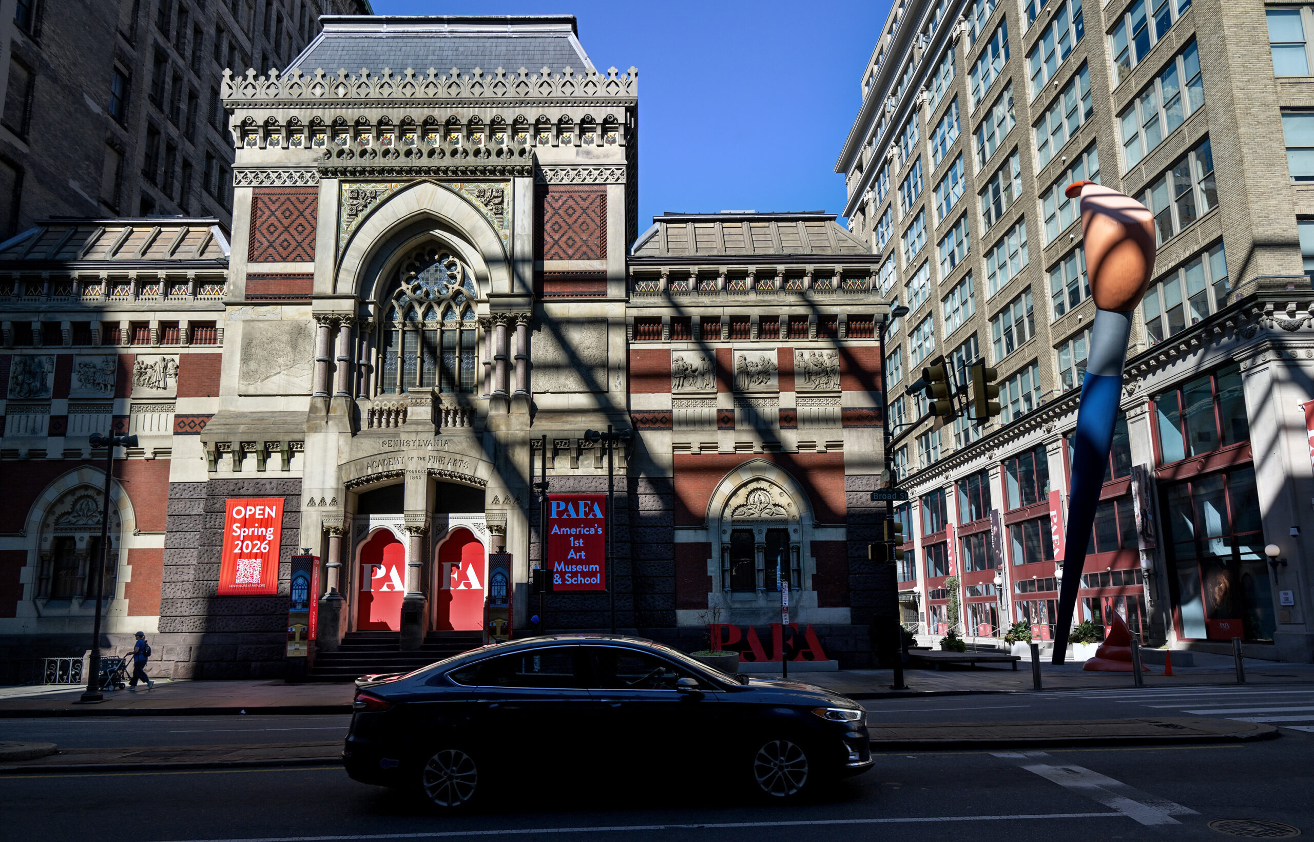 The Pennsylvania Academy of the Fine Arts Furness and Hewitt-designed building (left), with banners announcing the building’s reopening in Spring 2026, and the Samuel M.V. Hamilton Building (right) on N. Broad St., Sept. 28, 2025. In between is the 51-foot-high ‘Paint Torch’ sculpture by Claes Oldenburg.