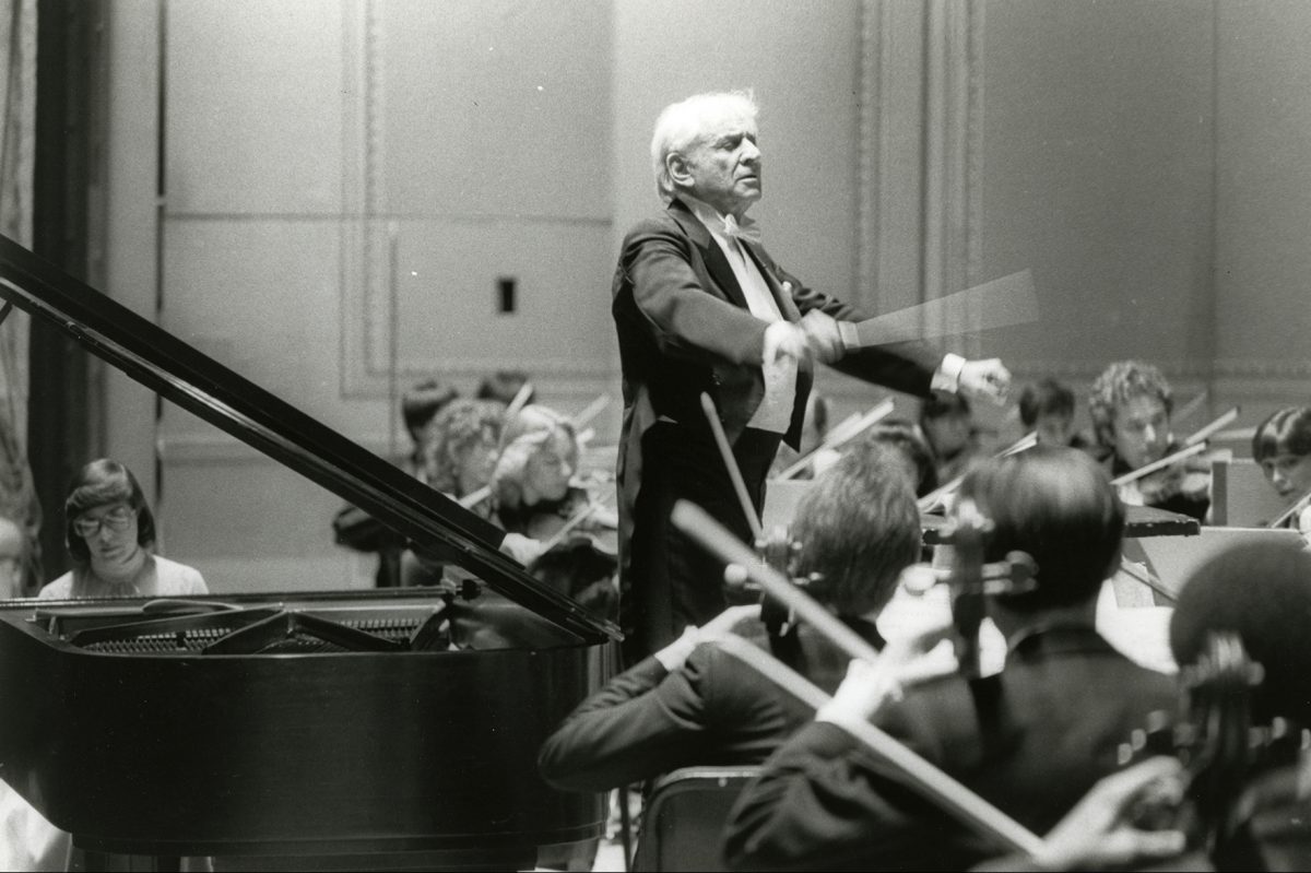 Leonard Bernstein conducts the Curtis Symphony Orchestra with soloist Susan Starr in a 1984 performance at the Academy of Music.