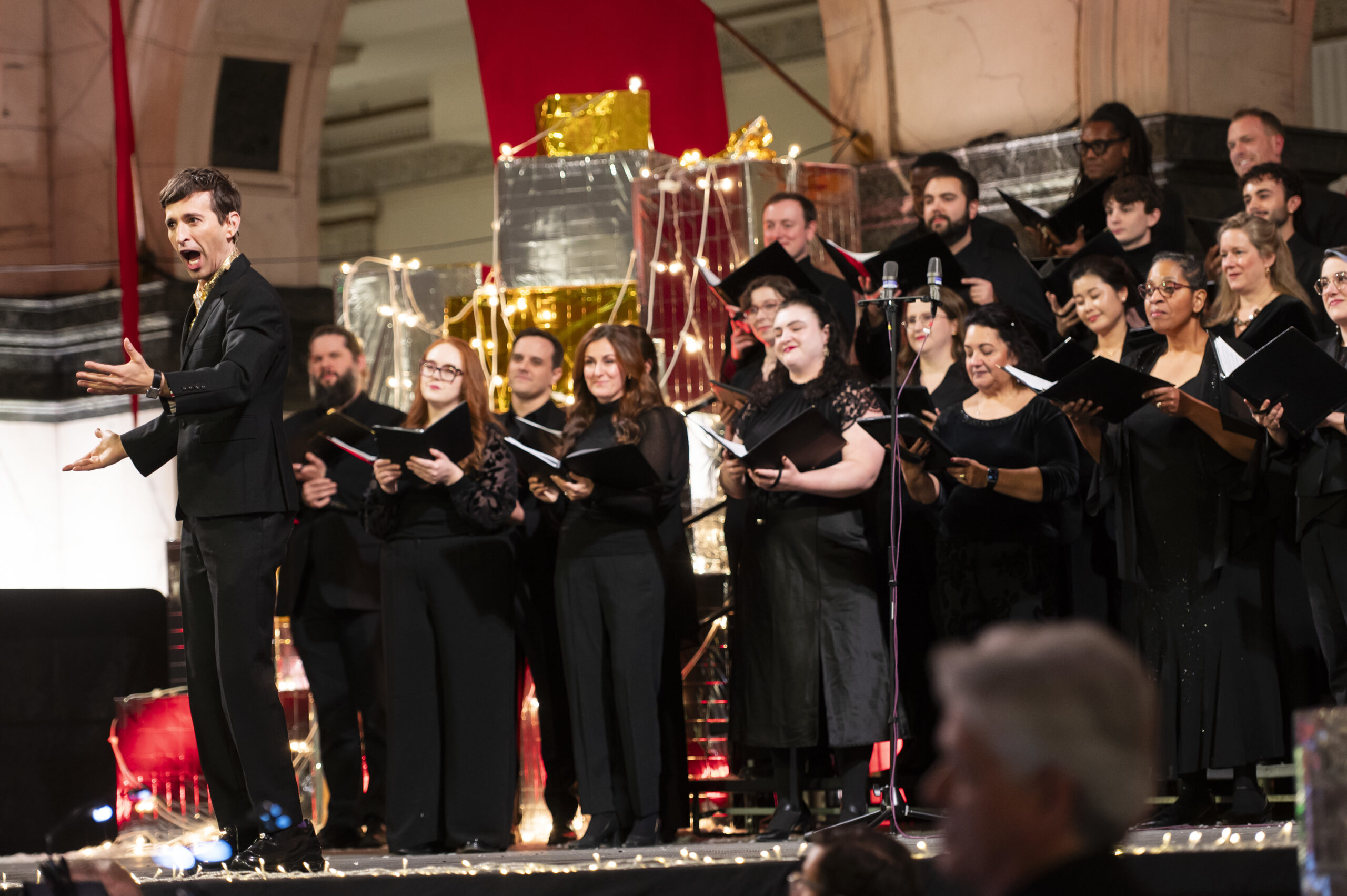 Anthony Roth Costanzo, countertenor, sings with Opera Philadelphia’s chorus during ‘Home for the Holidays’, a concert part of the ‘Pipe Up!’ series at the Wanamaker Building’s Grand Court, Dec. 2, 2025.