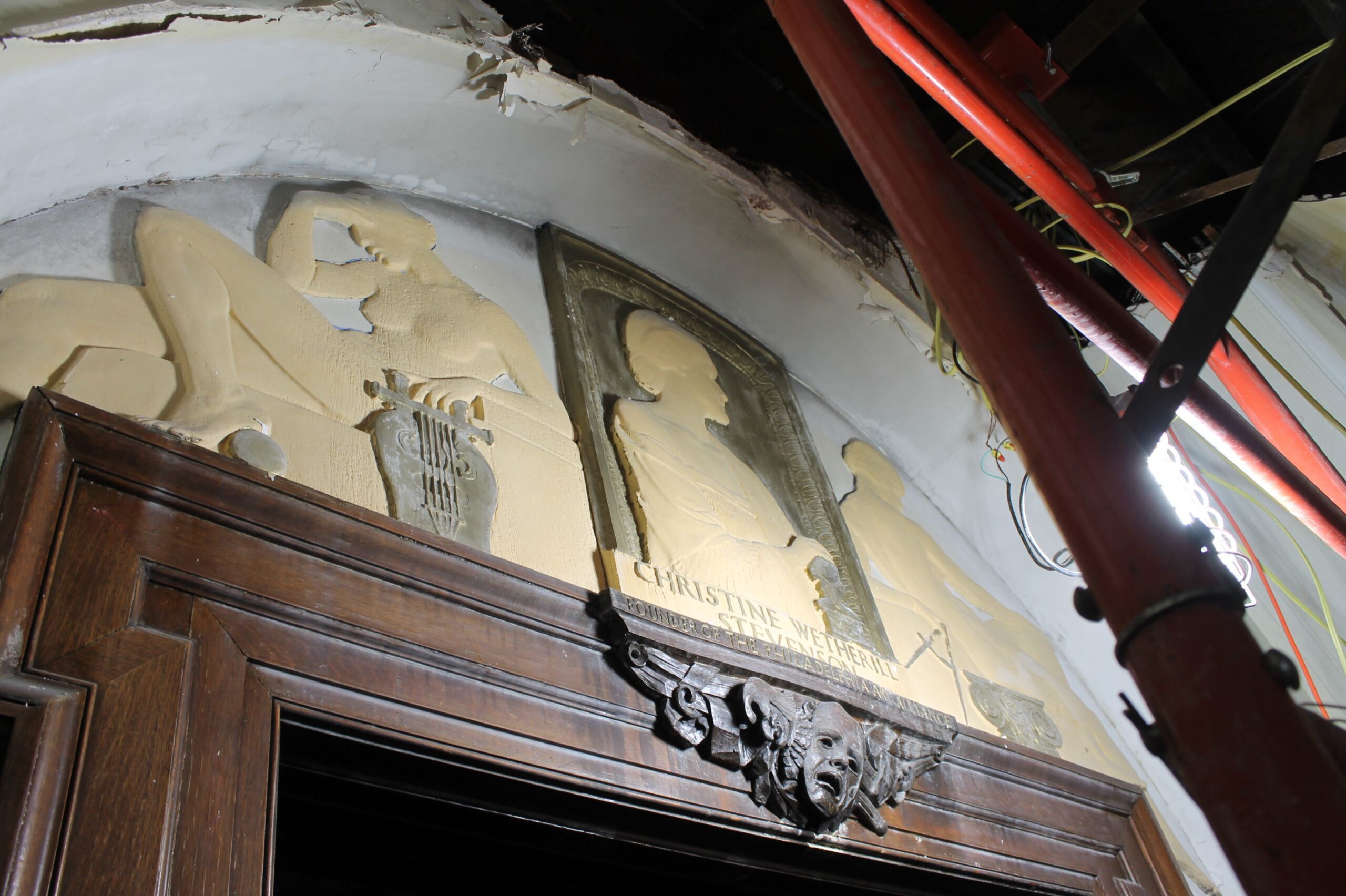 At the Art Alliance building on Rittenhouse Square, a detail of a memorial to Alliance founder Christine Wetherill Stevenson, on the first floor, Jan. 27, 2026. The building, owned by the Curtis Institute of Music, was damaged in a fire early on the morning of July 4, 2025.