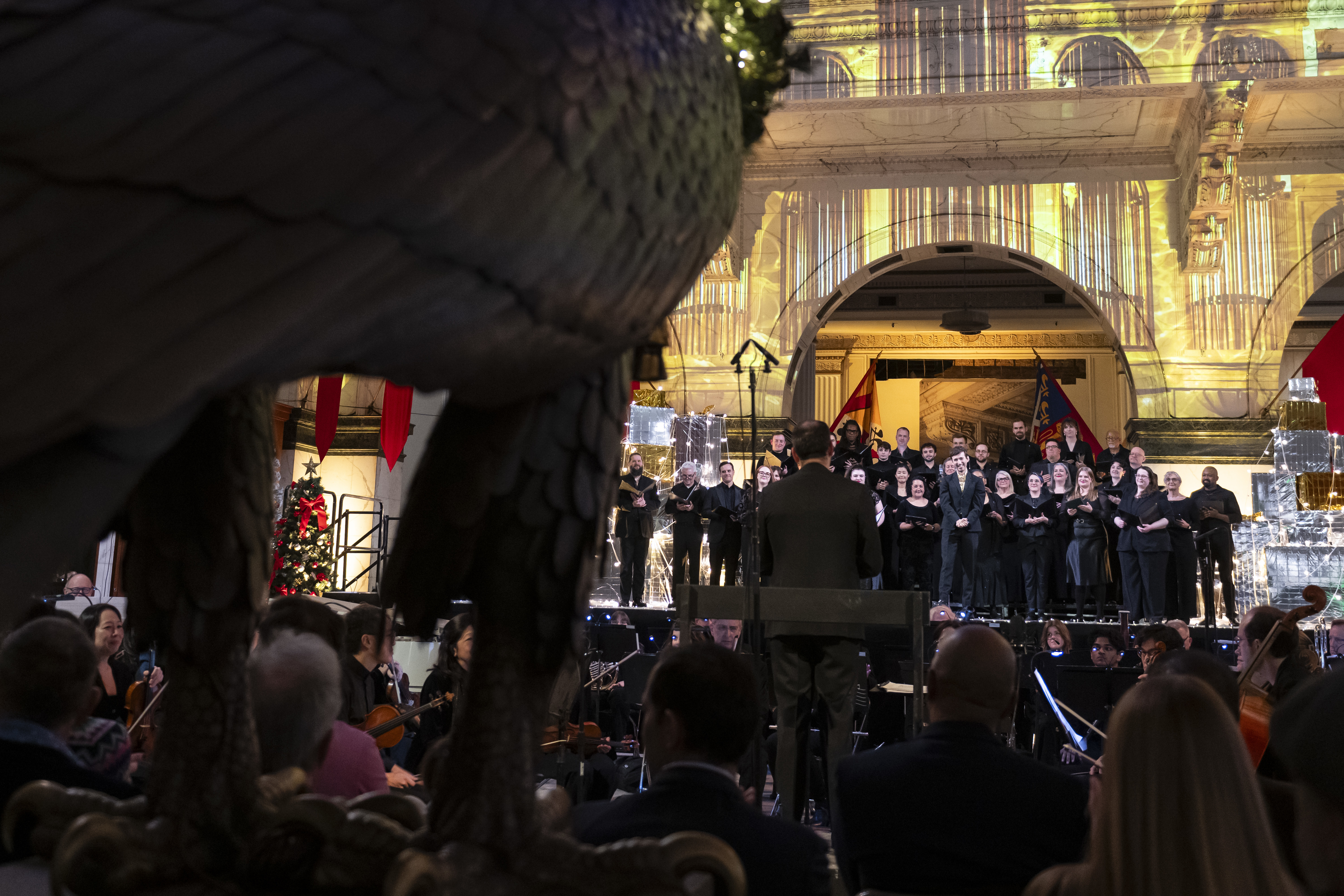The Christmas tree was indeed magical and the music, in turns, brilliant and warmly enveloping. Even the Wanamaker Eagle got into the act, crowned for the occasion with a lit Christmas wreath hung around its neck.