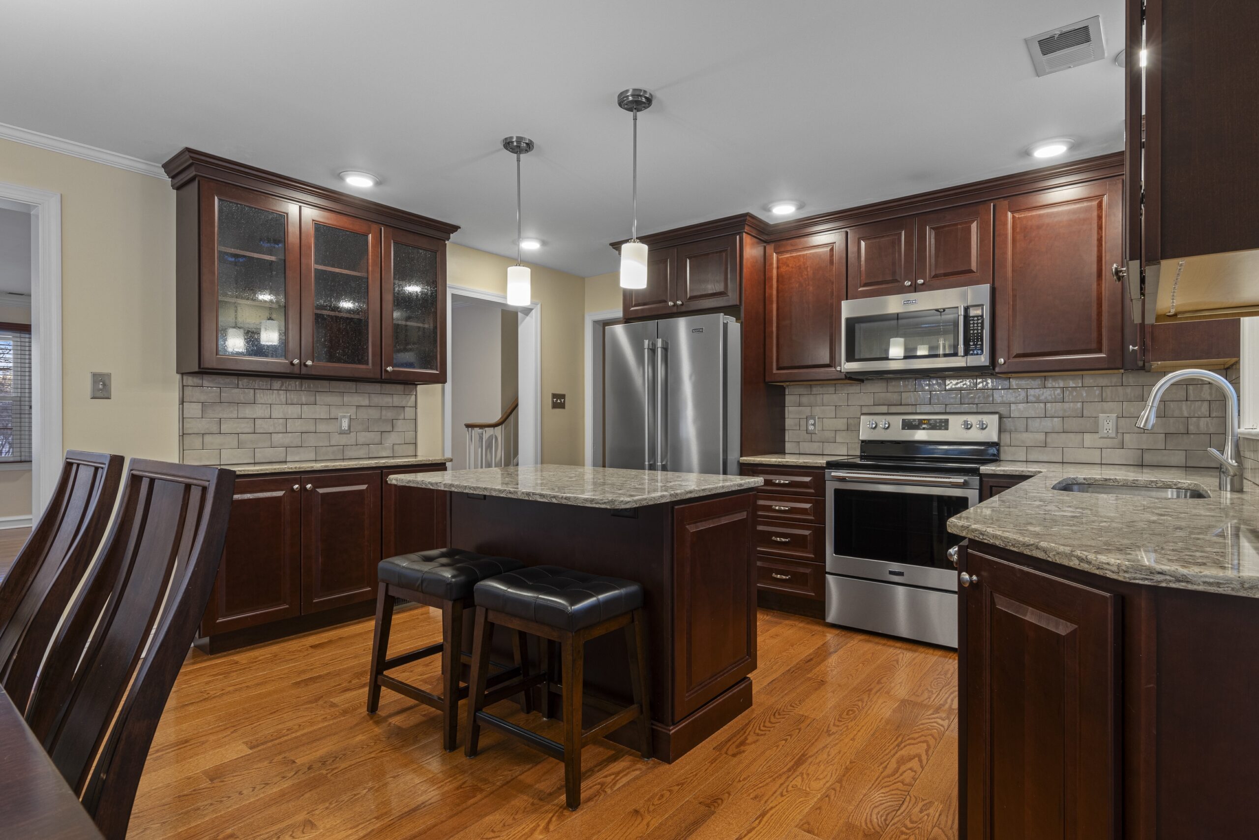 Built in 1952, this four-bedroom Wynnewood home blends past and present thanks to its classic stone exterior. The home’s first floor features a living room with a fireplace, a dining room, a home office with an exterior entrance, a family room with vaulted ceilings and built-ins, and an eat-in kitchen with an island and double ovens. The bedrooms are all on the second floor, including the primary suite, which has two closets and a bathroom with marble floors and a steam shower. Other features include a screened-in porch, a flagstone patio, and a finished walk-out basement.