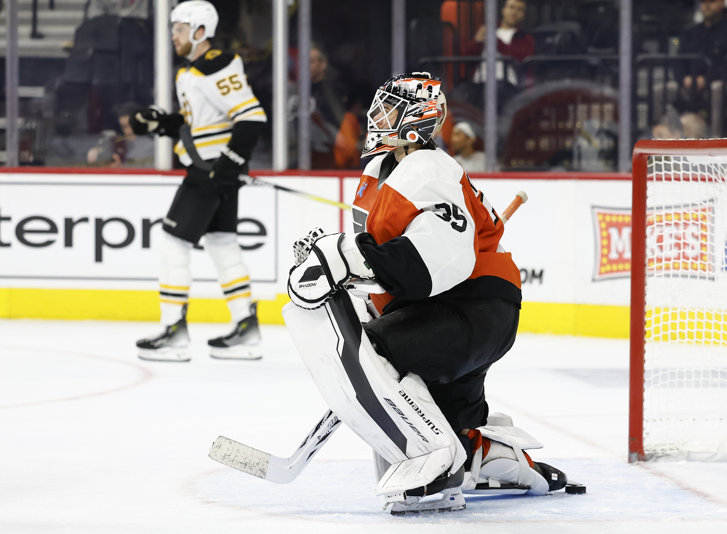 After a more energetic start to Period 2 from the Flyers, Boston made it 3-0 just over two minutes into the frame. Fraser Minten glided down the left wing and beat Ersson five-hole with a shot on the ice. after the Bruins had turned a Bobby Brink turnover into a transition three-on-two. The goal was another that Ersson will feel he should have stopped, especially after he had made a couple more difficult saves just prior.