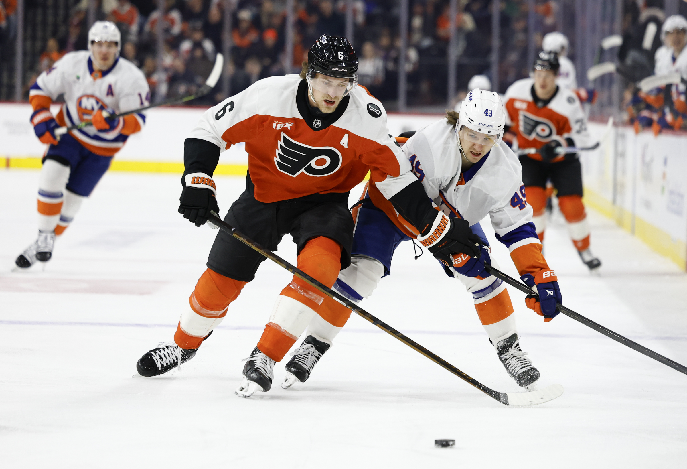 Travis Konecny leads the Flyers in goals (21), assists (29), and points (50), and is second behind Noah Cates (plus-15) among the team’s forwards with a plus-eight rating. The veteran sniper fired a hat trick in Columbus on Wednesday and followed it up with a goal and an assist in Boston a night later.