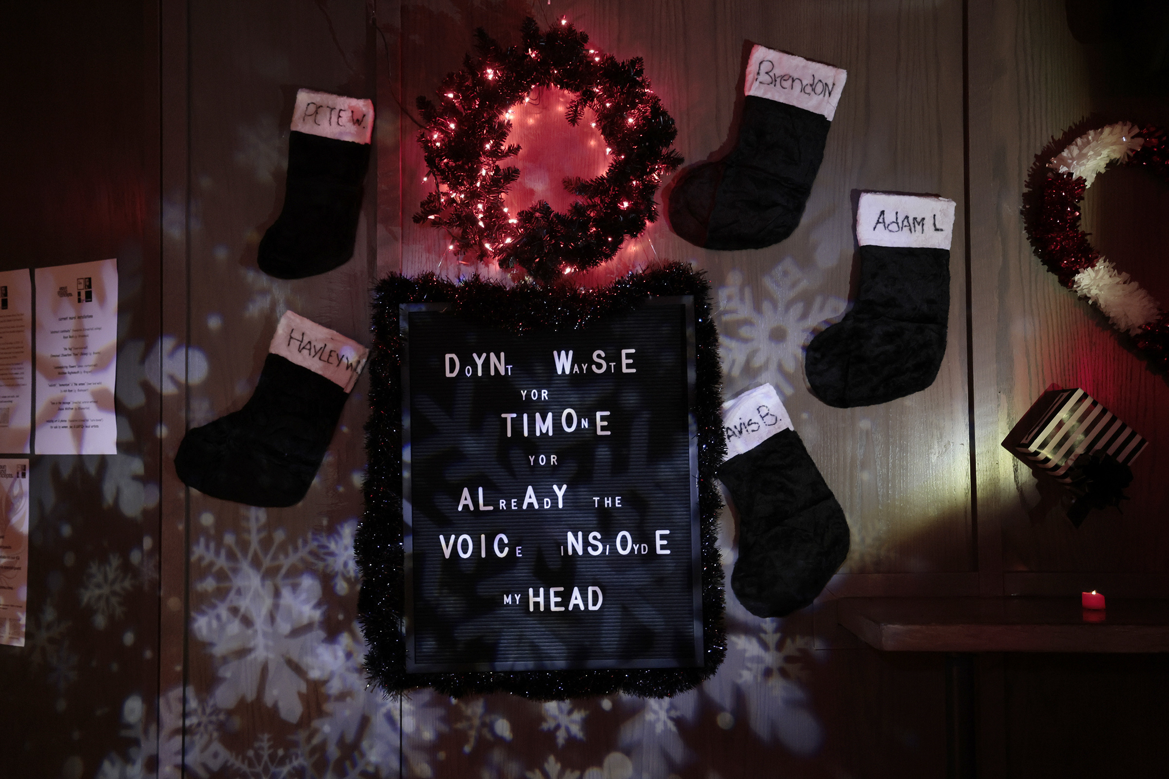 It’s clear the space was decorated by posers. The back wall is covered in Christmas stockings labeled in chicken-scratch with the names of so-called pop-punk greats: Brendon Urie, Pete Wentz, and my personal favorite, Tavis B., a misspelled bastardization of Blink 182 drummer Travis Barker.
