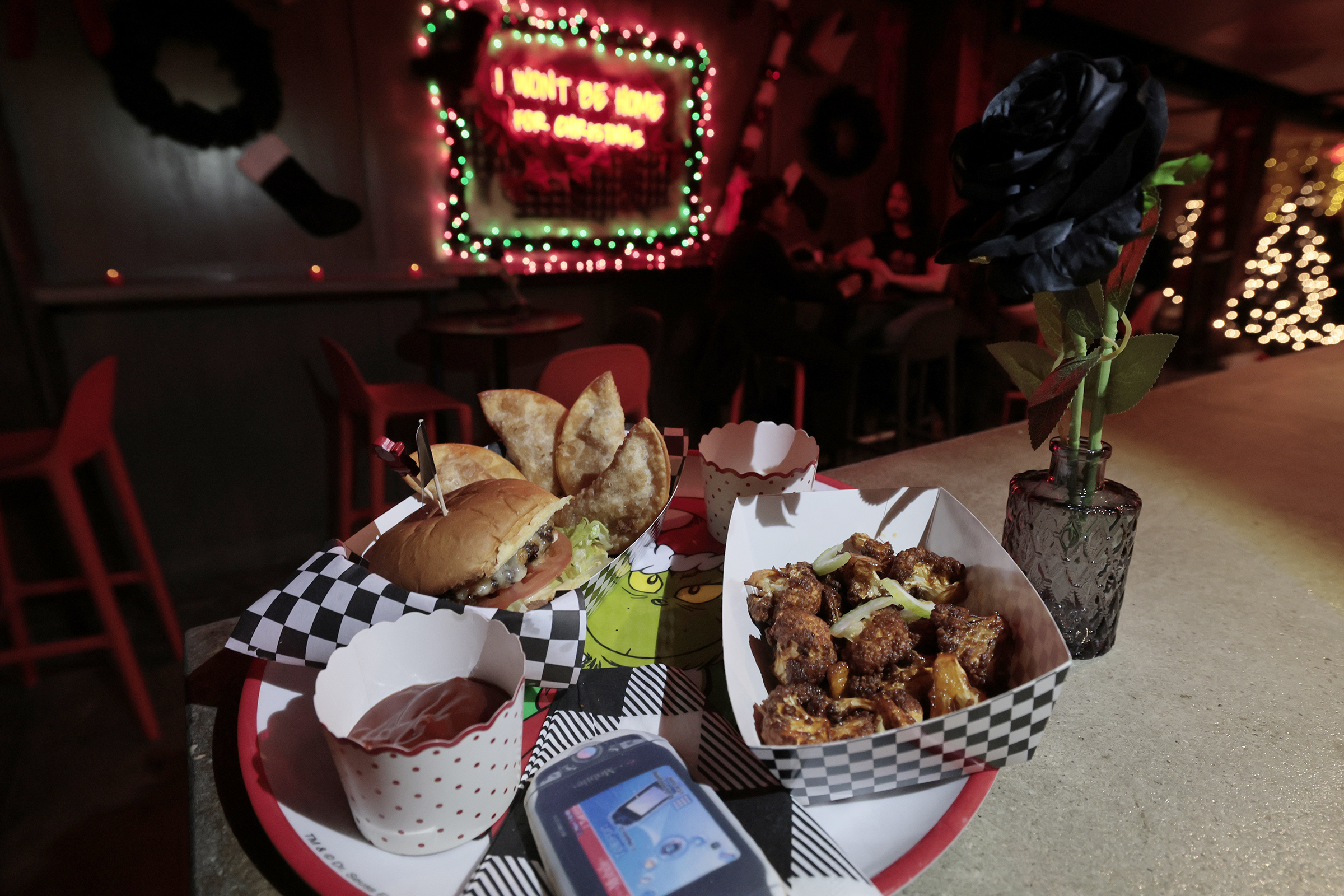Buffalo cauliflower, pizza bites, and a slider from the Bucket Lister’s Emo Christmas Bar pop-up in Philly. Tickets start at $16.00 and do not include food or drink beyond a welcome cocktail.