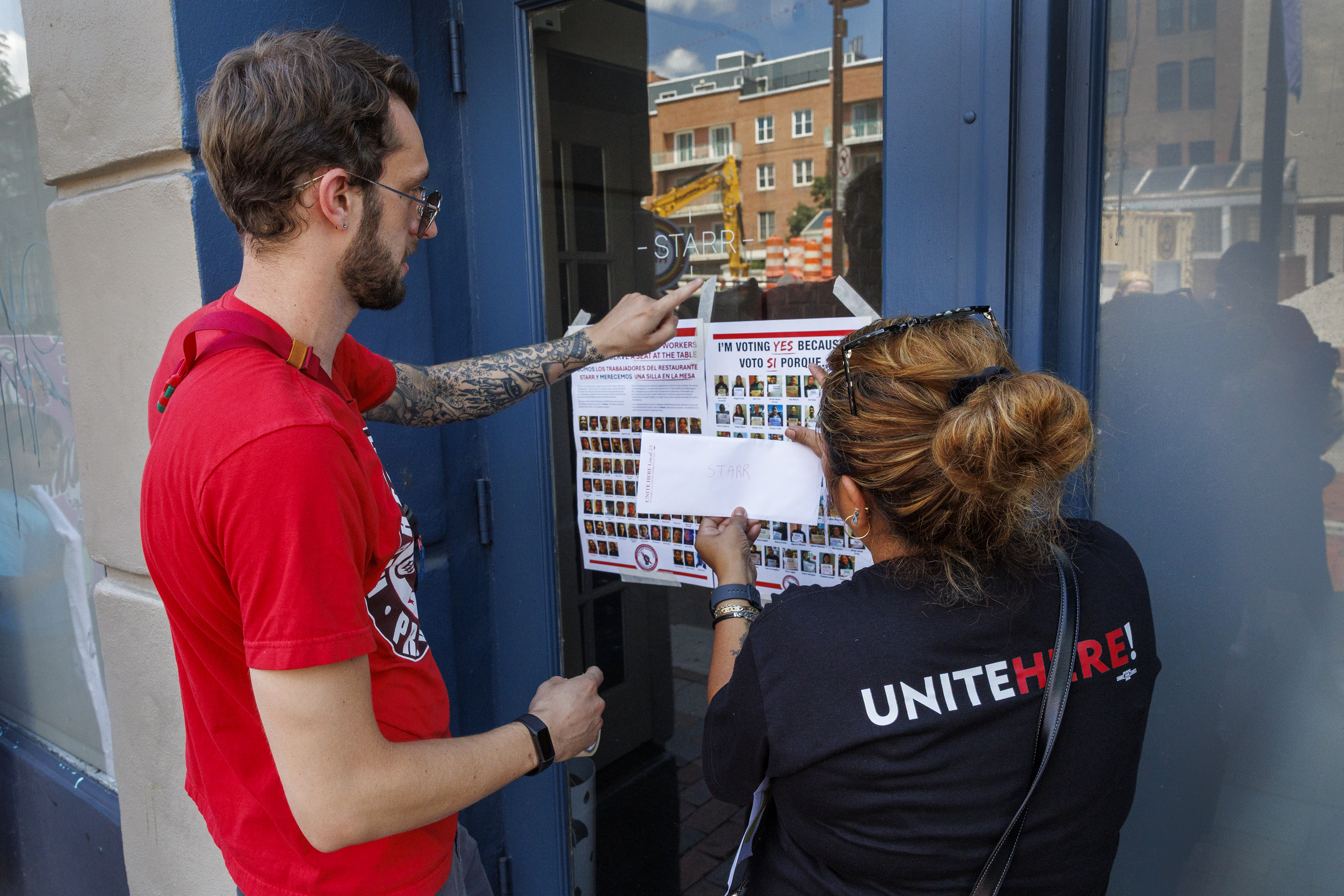 Greg Varney (left) and Ana Reyes, both with Unite Here Local 25, outside Starr headquarters at 134 Market St. as they work to unionize.