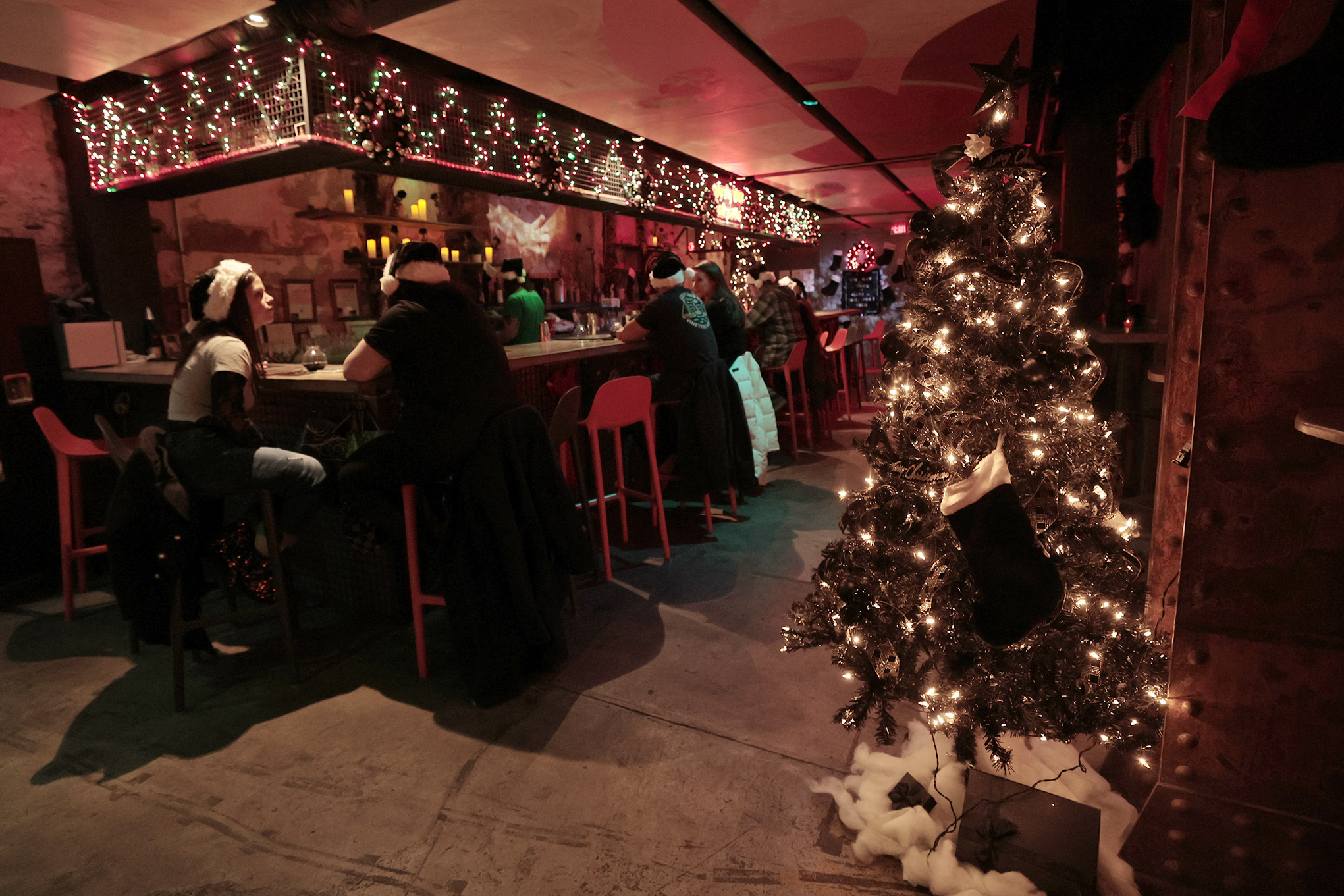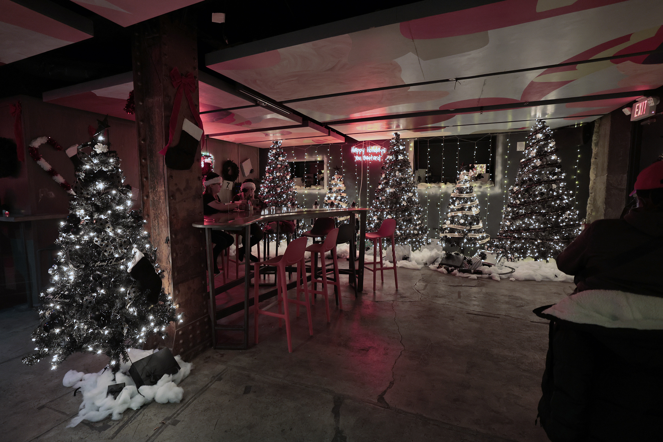 Christmas trees decorate the dimly lit seating area inside the Bucket Listers’ Emo Christmas Bar pop-up at Foundation.