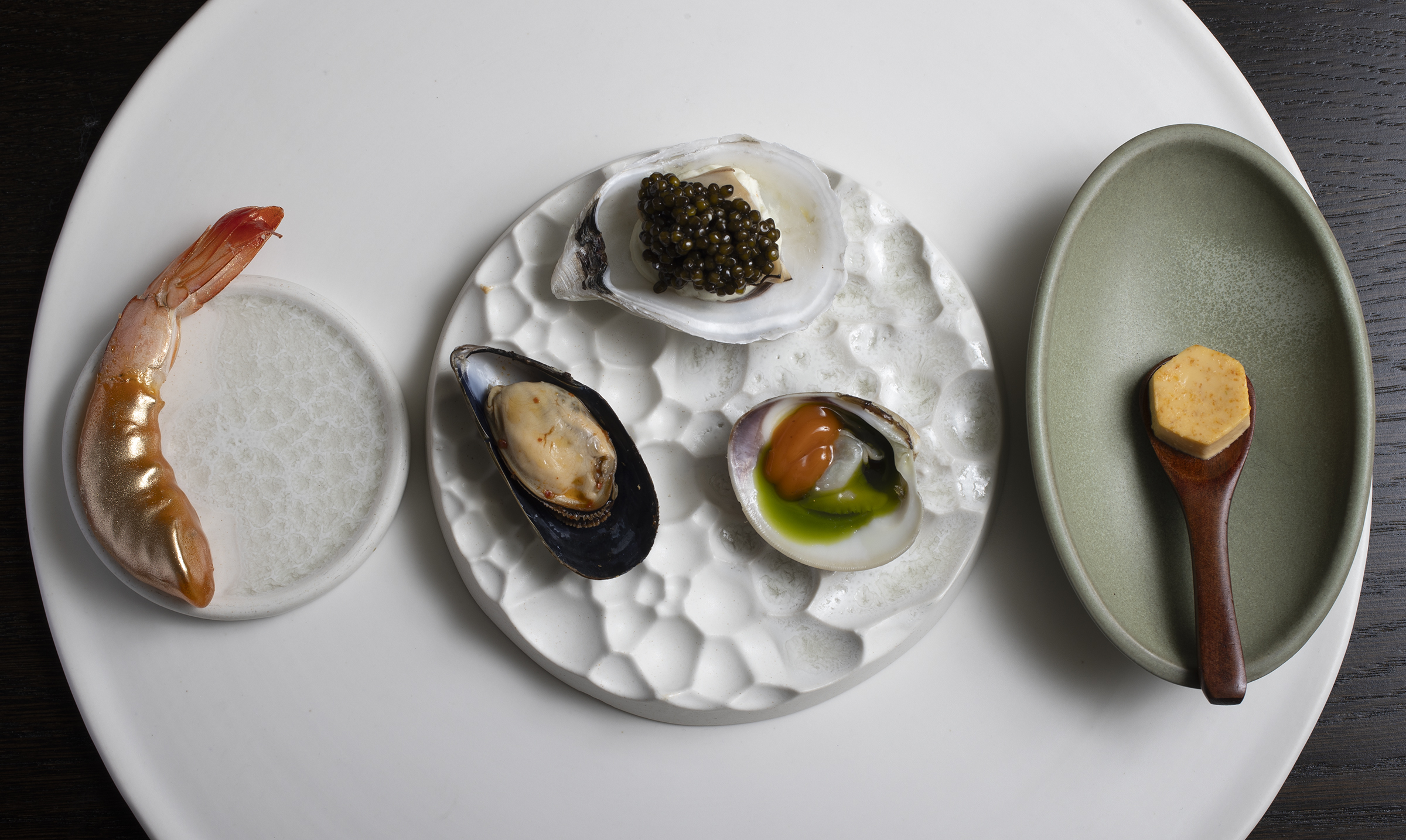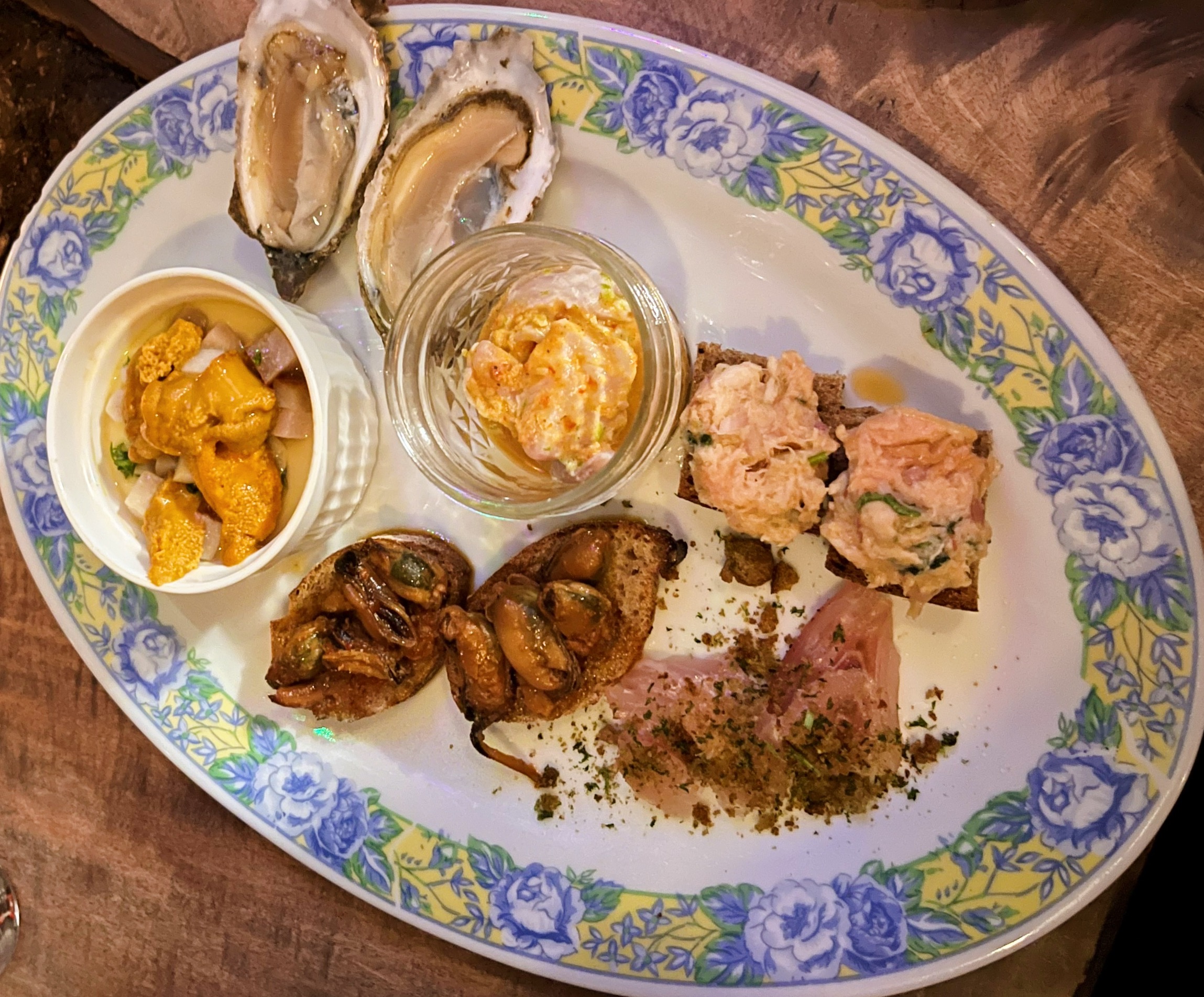 The egg custard with uni and swordfish bacon (far left) was served as part of a platter of raw and cooked seafood for the first course at Heavy Metal Sausage Co.’s Feast of More Than Seven Fishes.
