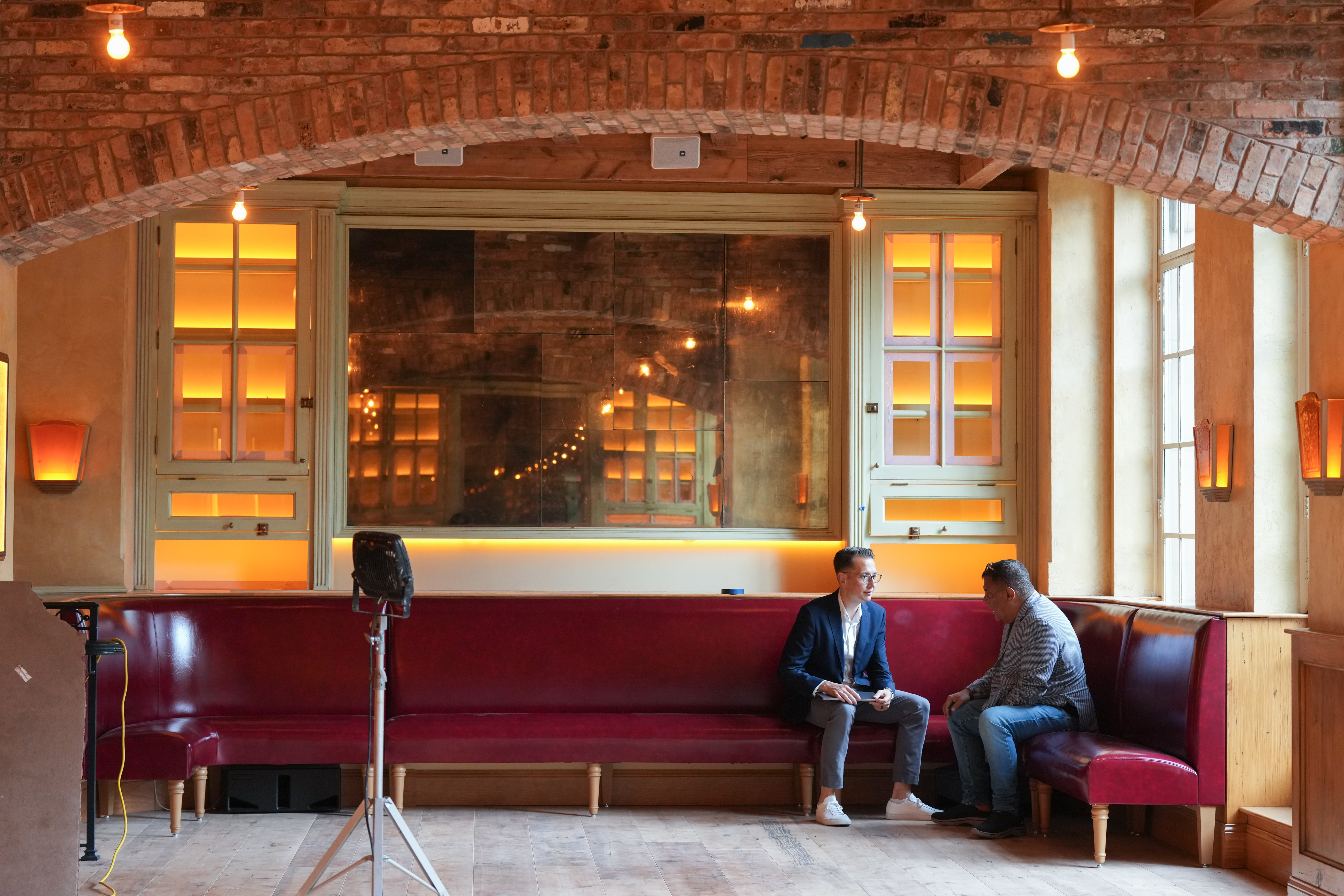 Stephen Starr (right) talks with Erik Battes, Starr Restaurants’ executive vice president of food and beverage, during at a menu-tasting for the Italian restaurant Borromini, in Philadelphia, July 1, 2025.