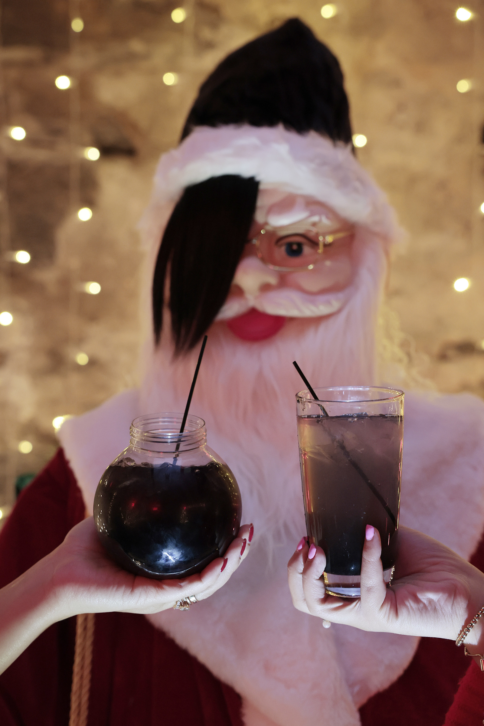 The decorations feel half-baked, amountingto fake Christmas trees and a trio of full-sized nutcrackers that had black Sharpie smeared under their eyes to mimic eyeliner. Across from them stood a mannequin dressed as Santa, with swide-swept fringe bangs so you know he’s emo. Like everything else in the bar, he smelled lightly of kitchen grease.