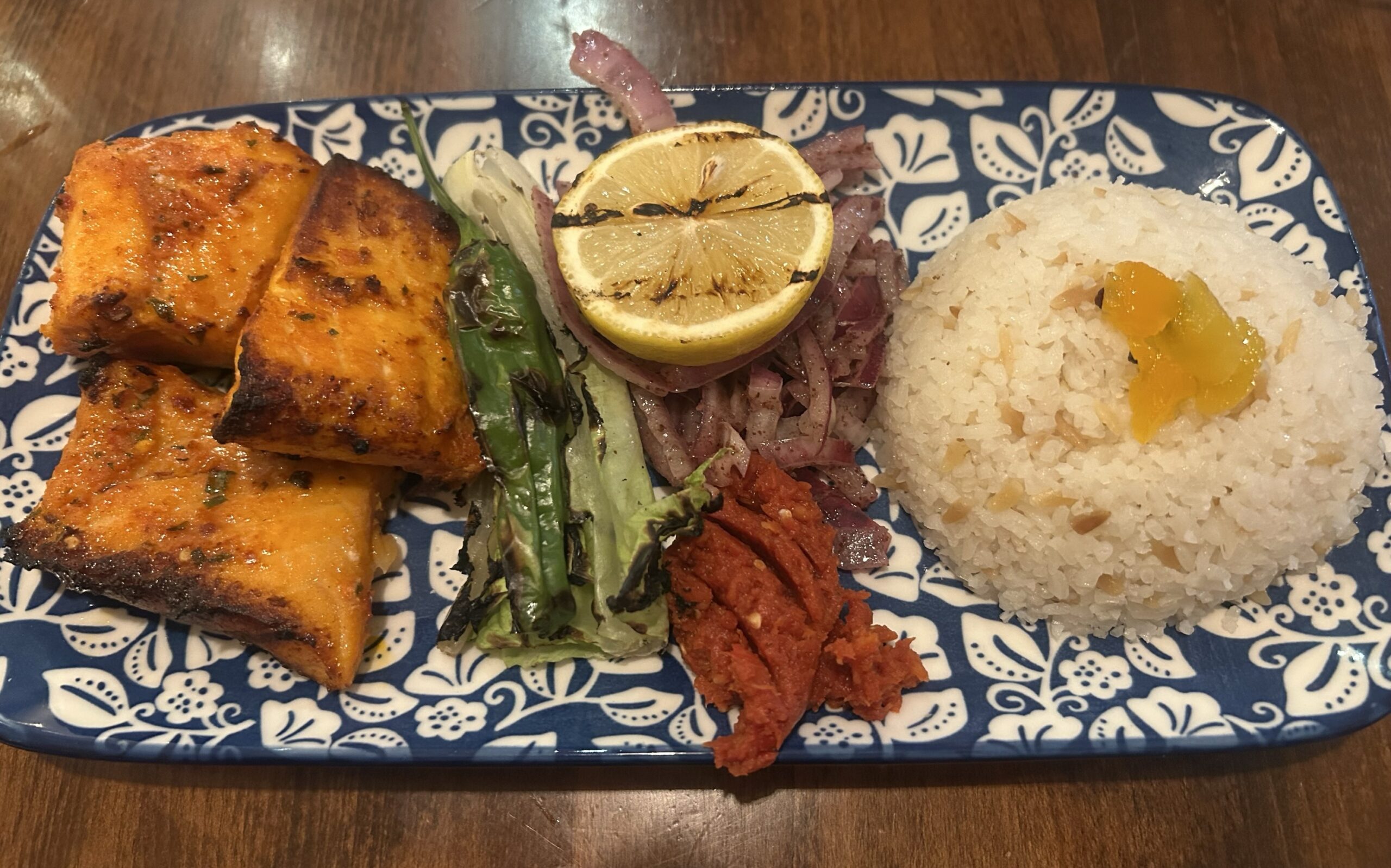 The salmon kebab from Kanella comes plated with grilled green lettuce, fiery red harissa, sweet purple onions, and a wedge of lemon.