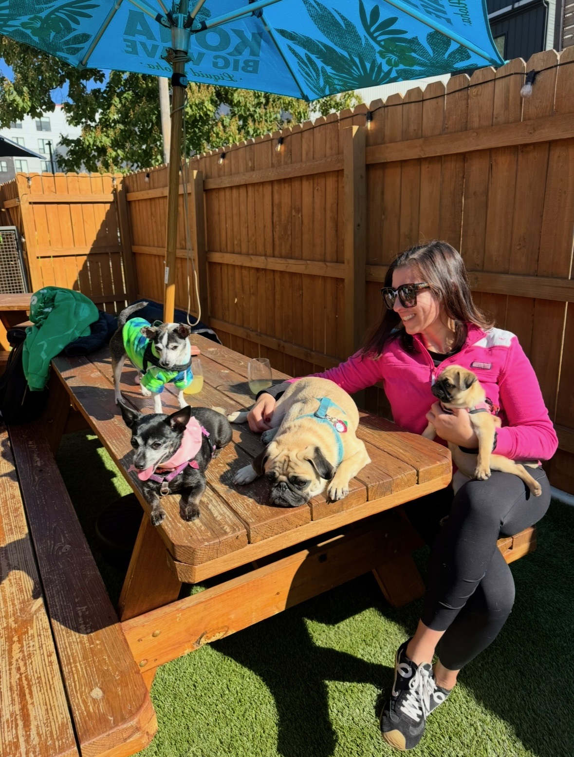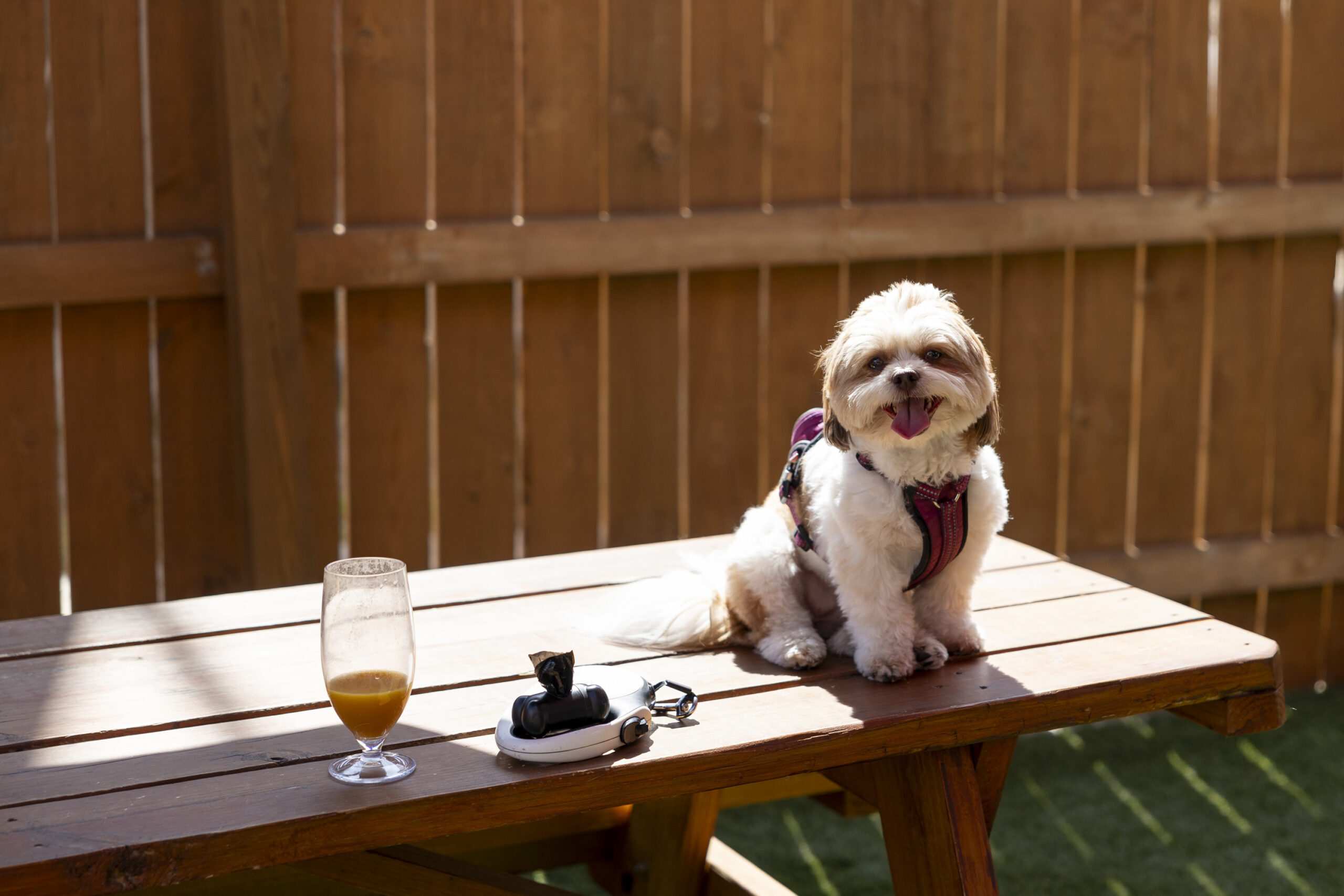 Darby, a 5-year-old shih tzu, sits on a picnic table at the Boozy Mutt in Fairmount during an August 2025 breed meetup.