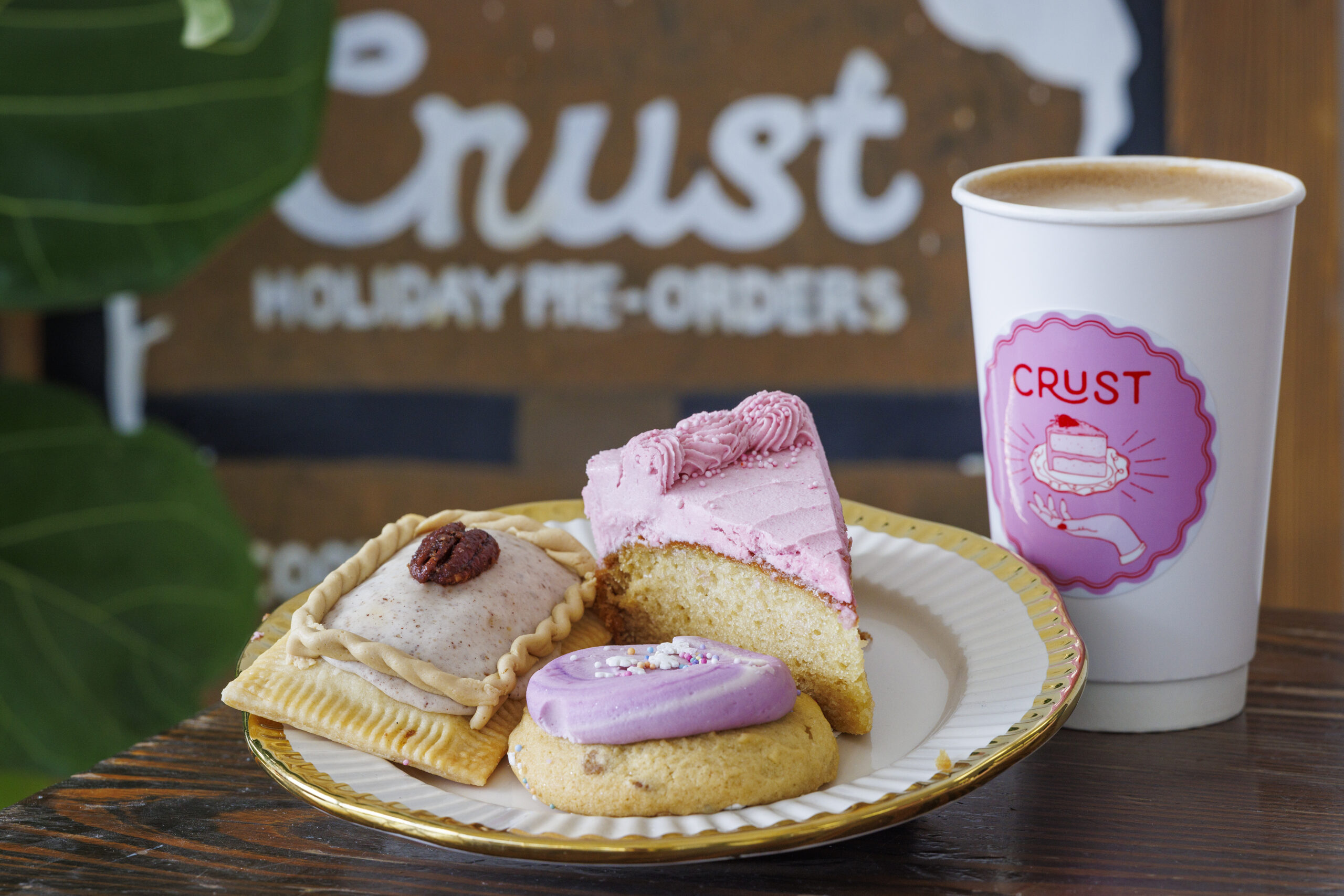 A brown sugar pecan pie pop-tart, soft frosted cookie, and vanilla strawberry cake from Crust Vegan Bakery are plated next to a hot latte. Beverages are new to the bakery.