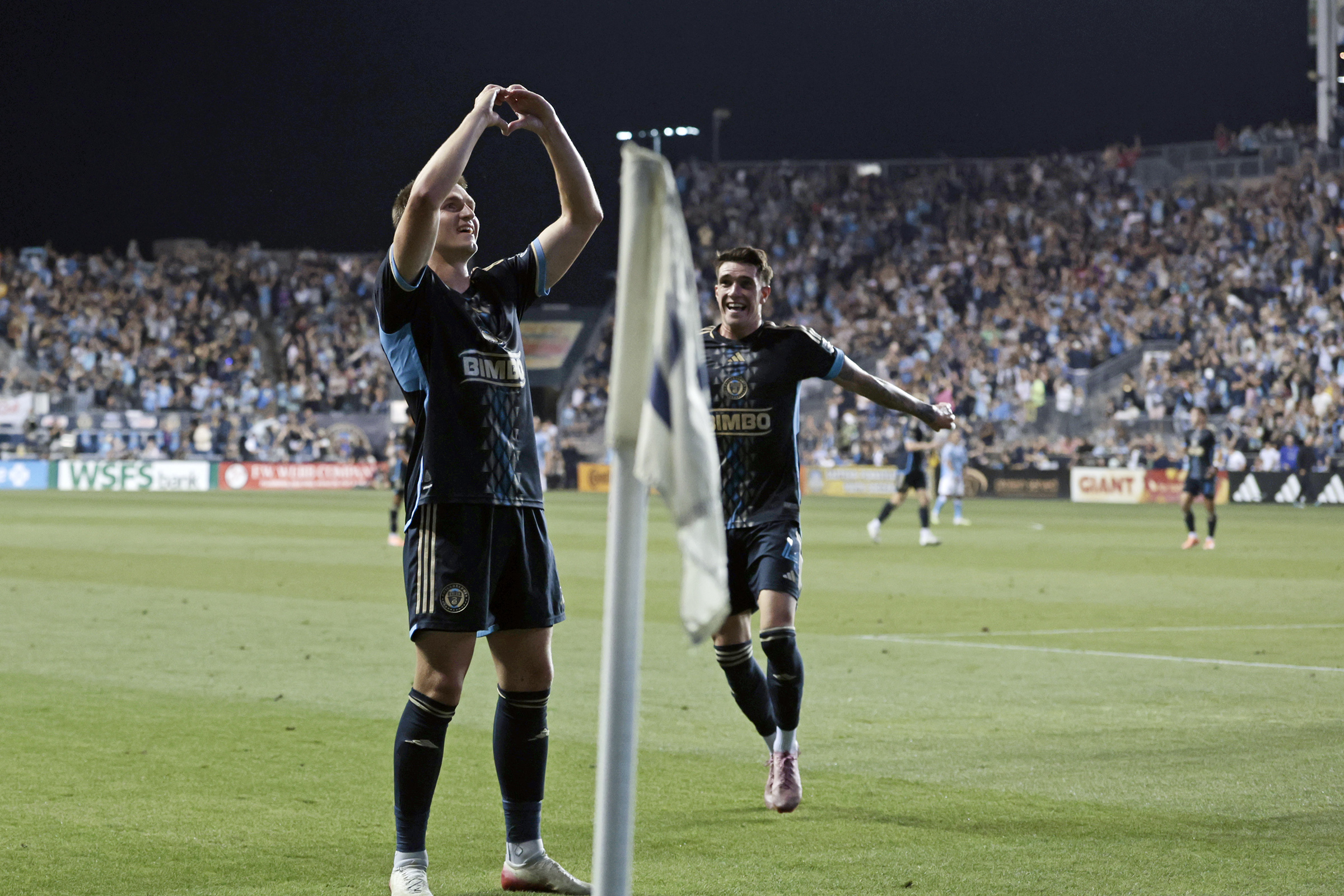 The Union’s Mikael Uhre (left) and Jovan Lukic celebrate Uhre’s goal against New York City FC on Oct. 4.
