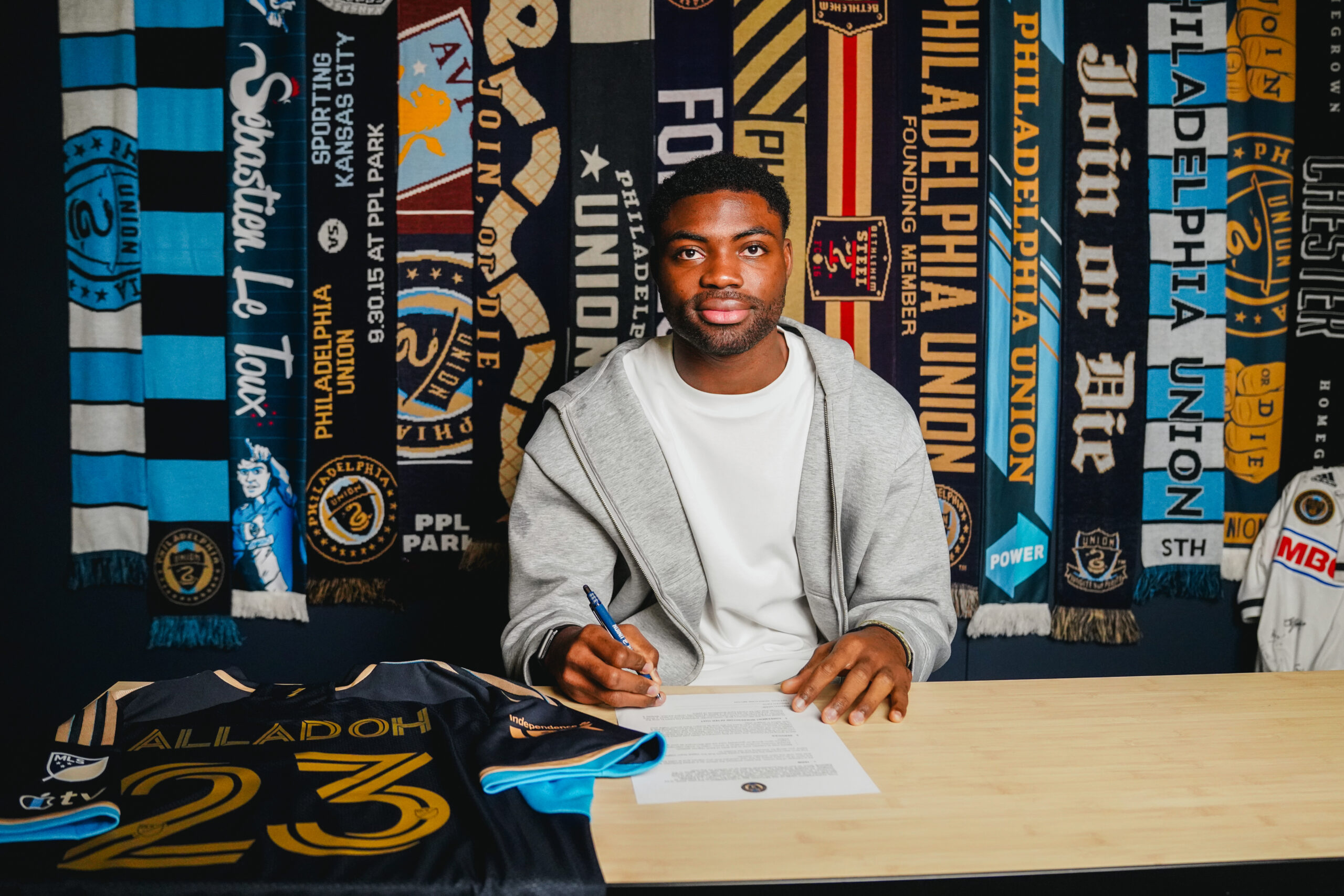 Ezekiel Alladoh signs his new Union contract at the team’s practice facility on Dec. 3.
