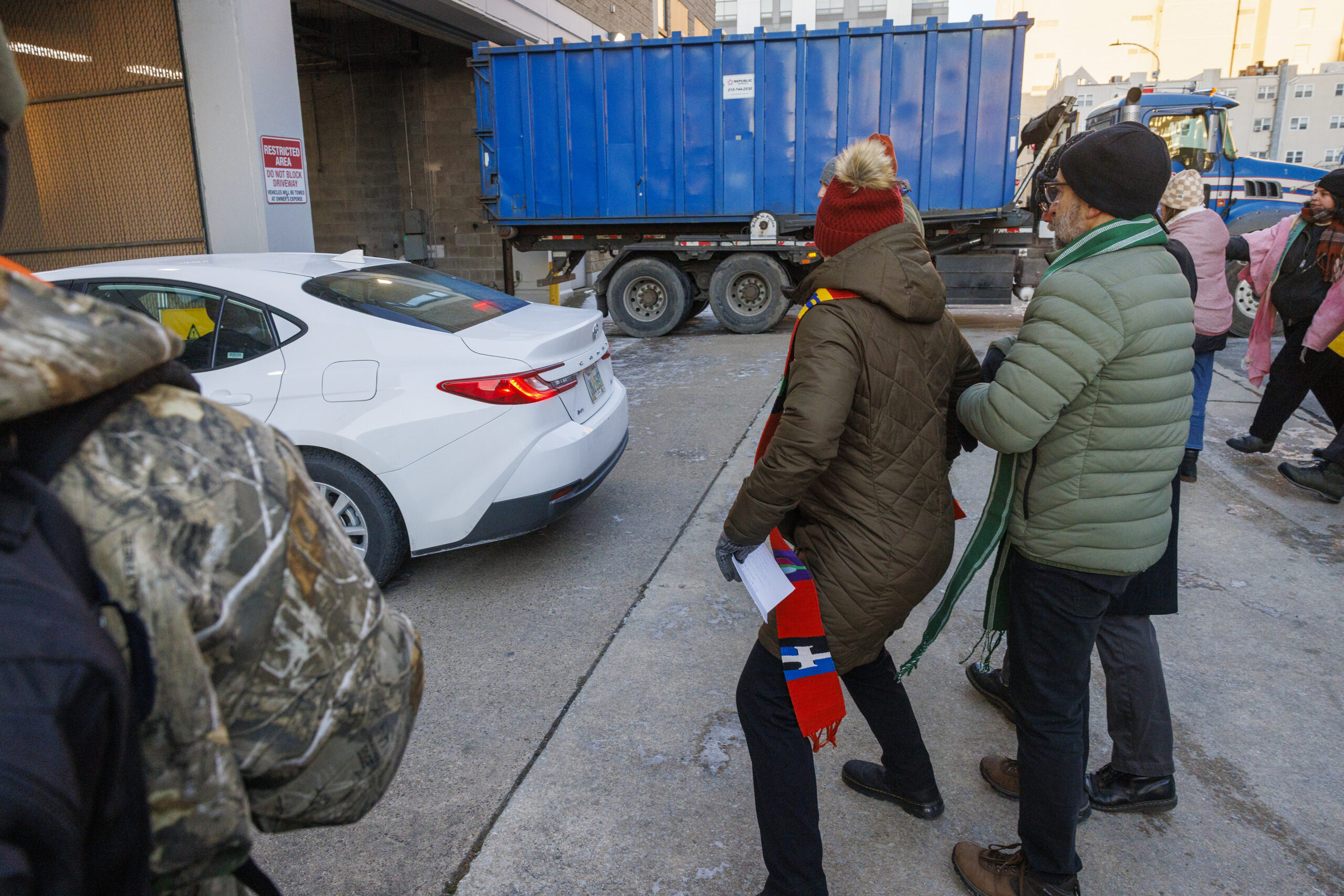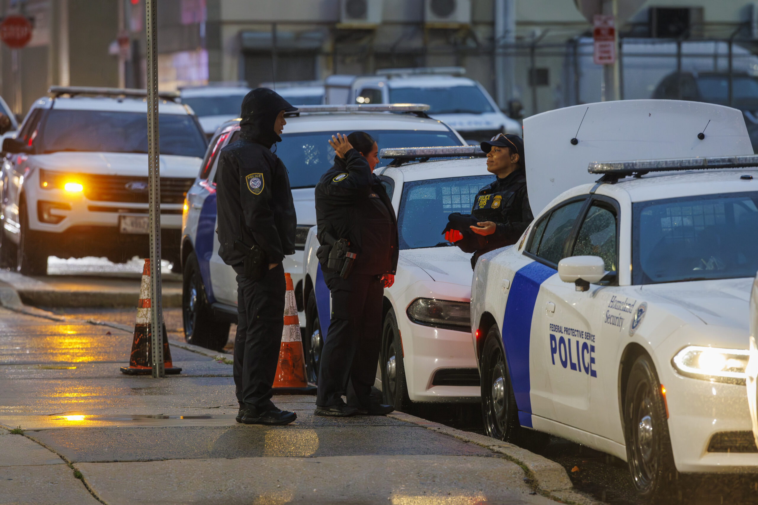 Just before 9:30 a.m., a white sedan – which had initially been blocked by protesters – was able to exit the ICE headquarters parking bay with the help of Philadelphia Police.