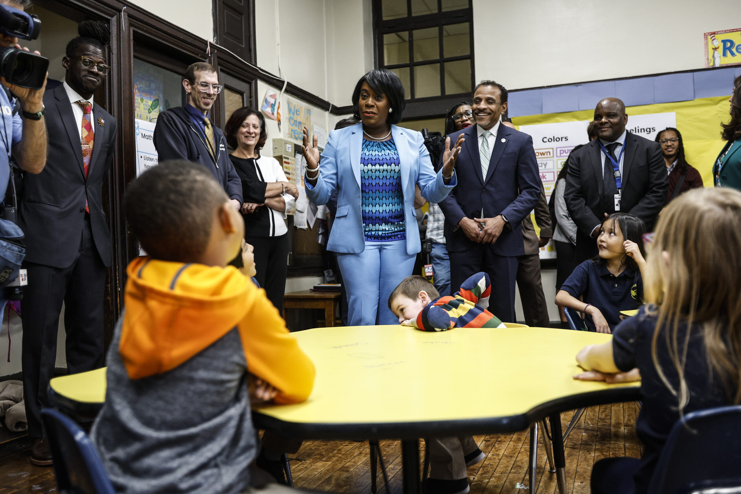 Mayor Cherelle Parker and Superintendent Tony B. Watlington Sr. visit a classroom at Southwark Elementary to discuss the city’s extended day extended year programming in this 2024 file photo.