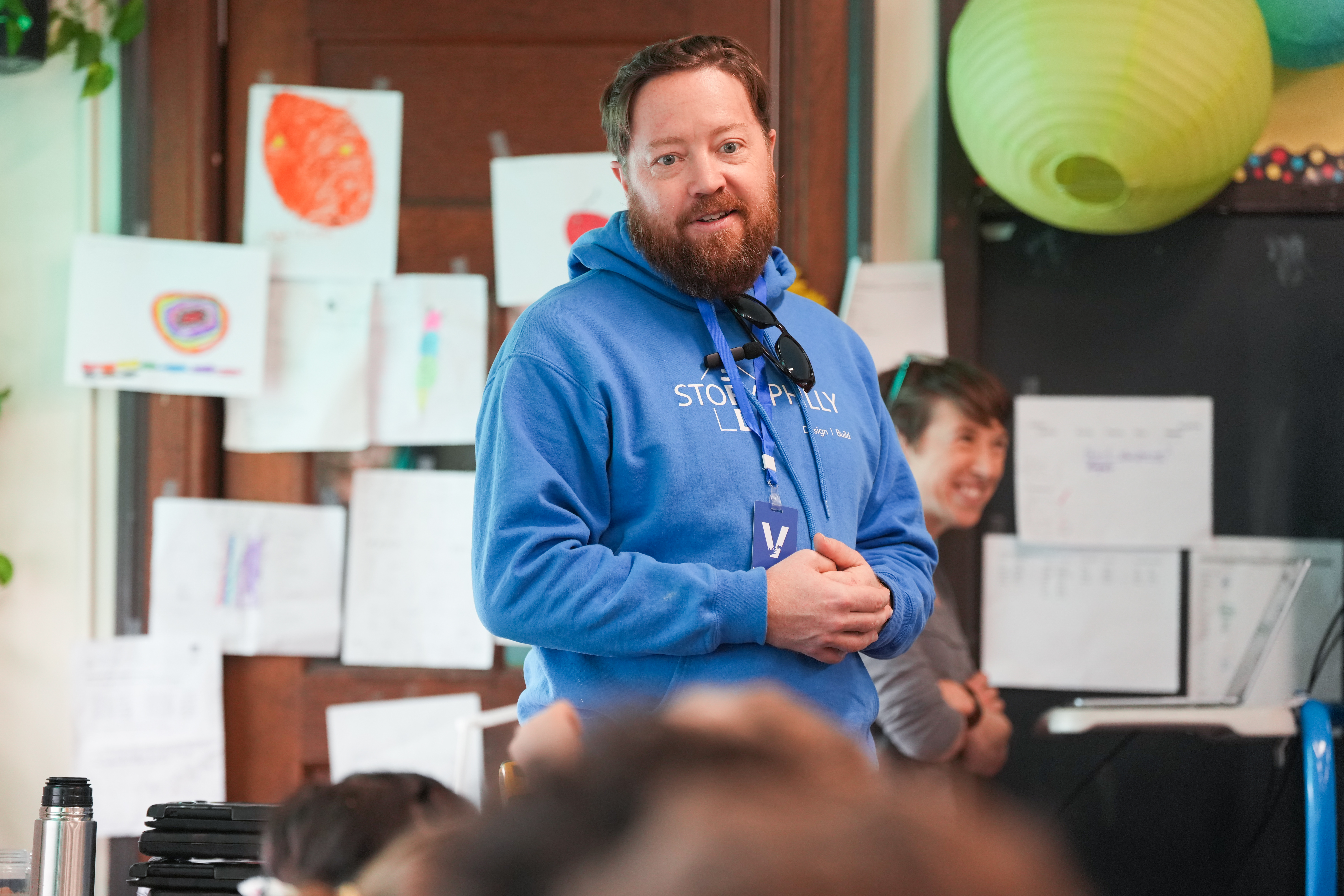 Zach Winters, cofounder and partner at 3rd Story Philly, talks with students at Fanny Jackson Coppin School, in Philadelphia, December 05, 2025.