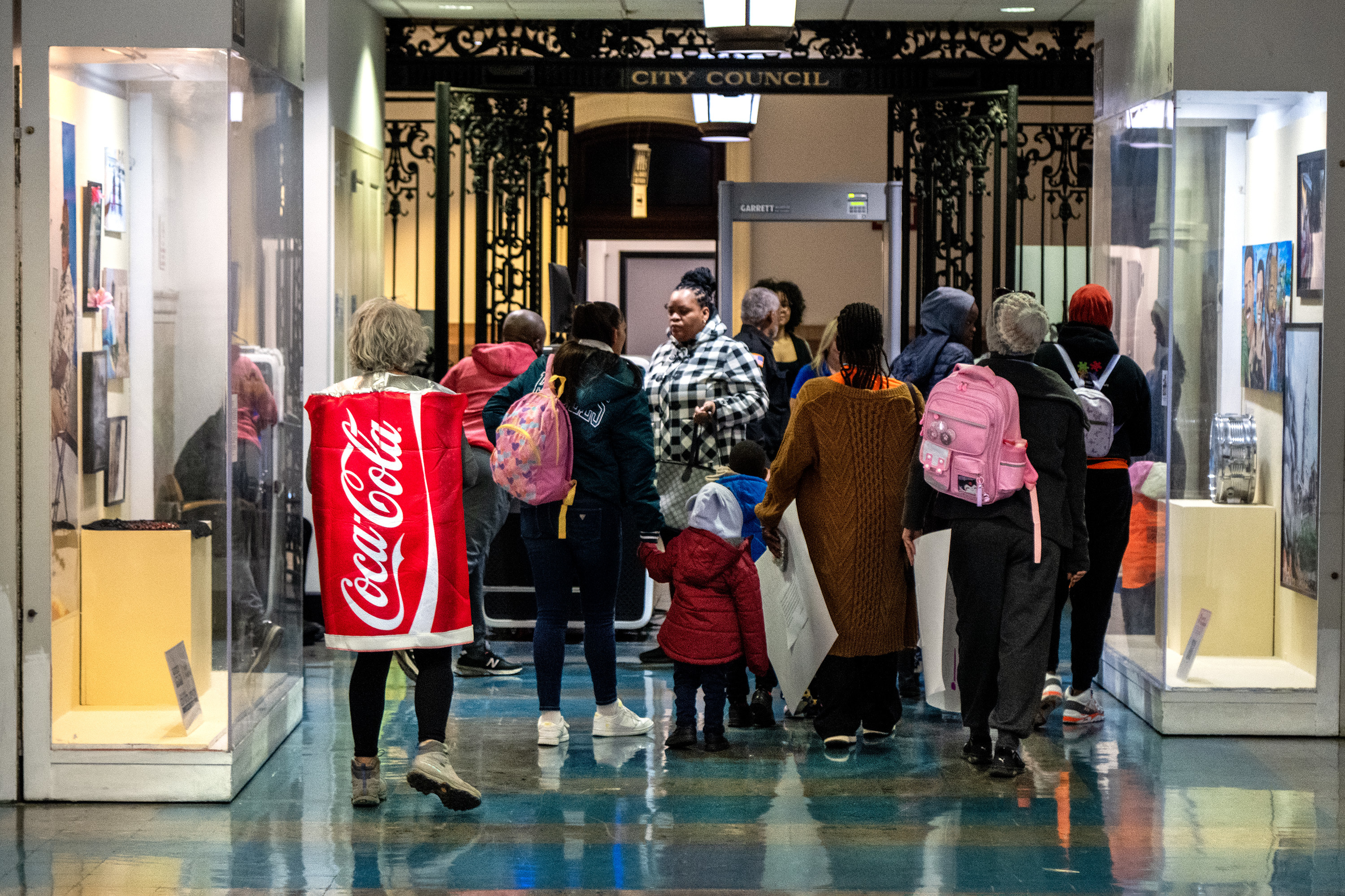 January 26, 2026: The President’s House in Independence National Historical Park hours Jan, 22, after all historical exhibits were removed following President Trump’s Executive Order last March that the content at national parks that “inappropriately disparage” the U.S. be reviewed. The site, a reconstructed “ghost” structure titled “Freedom and Slavery in the Making of a New Nation” (2010), serves as a memorial to the nine people George Washington enslaved there during the founding of America.January 19, 2026: A low-in-the-sky winter sun is behind the triangular pediment of the “front door” of the open-air President’s House installation in Independence National Historical Park. The reconstructed “ghost” structure with partial walls and windows of the Georgian home known in the 18th century as 190 High St. is officially titled, “Freedom and Slavery in the Making of a New Nation” (2010). It is designed to give visitors a sense of the house where the first two presidents of the United States, George Washington and John Adams, served their terms of office. The commemorative site designed by Emanuel Kelly, with Kelly/Maiello Architects, pays homage to nine enslaved people of African descent who were part of the Washington household with videos scripted by Lorene Cary and directed by Louis Massiah. Deepika Iyer holds her niece Ira Samudra aloft in a Rockyesque pose, while her parents photograph their 8 month-old daughter, in front of the famous movie prop at the top of the steps at the Philadelphia Art Museum. Iyer lives in Philadelphia and is hosting a visit by her mother Vijayalakshmi Ramachandran (partially hidden); brother Gautham Ramachandran; and her sister-in-law Janani Gautham who all live in Bangalore, India.January 5, 2026: Parade marshals trail behind the musicians of the Greater Kensington String Band heading to their #9 position start in the Mummers Parade. Spray paint by comic wenches earlier in the day left “Oh, Dem Golden Slippers” shadows on the pavement of Market Street. This year marked the 125th anniversary of Philly’s iconic New Year’s Day celebration.Dec. 29, 2025: Canada geese at sunrise in Evans Pond in Haddonfield, during the week of the Winter Solstice for the Northern Hemisphere. December 22, 2025: SEPTA trolley operator Victoria Daniels approaches the end of the Center City Tunnel, heading toward the 40th Street trolley portal after a tour to update the news media on overhead wire repairs in the closed tunnel due to unexpected issues from new slider parts.December 15, 2025: A historical interpreter waits at the parking garage elevators headed not to a December crossing of the Delaware River, but an event at the National Constitution Center. General George Washington was on his way to an unveiling of the U.S. Mint’s new 2026 coins for the Semiquincentennial, December 8, 2025: The Benjamin Franklin Bridge and pedestrians on the Delaware River Trail are reflected in mirrored spheres of the “Weaver’s Knot: Sheet Bend” public artwork on Columbus Boulevard. The site-specific stainless steel piece located between the Cherry Street and Race Street Piers was commissioned by the City’s Public Art Office and the Delaware River Waterfront Corporation and created and installed in 2022 by the design and fabrication group Ball-Nogues Studio. The name recalls a history that dominated the region for hundreds of years. “Weaver’s knot” derives from use in textile mills and the “Sheet bend” or “sheet knot” was used on sailing vessels for bending ropes to sails. November 29, 2025: t’s ginkgo time in our region again when the distinctive fan-shaped leaves turn yellow and then, on one day, lose all their leaves at the same time laying a carpet on city streets and sidewalks. A squirrel leaps over leaves in the 18th Century Garden in Independence National Historical Park Nov. 25, 2025. The ginkgo (Ginkgo biloba) is considered a living fossil as it’s the only surviving species of a group of trees that existed before dinosaurs. Genetically, it has remained unchanged over the past 200 million years. William Hamilton, owner the Woodlands in SW Phila (no relation to Alexander Hamilton) brought the first ginkgo trees to North America in 1785.November 24, 2025: The old waiting room at 30th Street Station that most people only pass through on their way to the restrooms has been spiffed up with benches – and a Christmas tree. It was placed there this year in front of the 30-foot frieze, “The Spirit of Transportation” while the lobby of Amtrak’s $550 million station restoration is underway. The 1895 relief sculpture by Karl Bitter was originally hung in the Broad Street Station by City Hall, but was moved in 1933. It depicts travel from ancient to modern and even futuristic times. November 17, 2025: Students on a field trip from the Christian Academy in Brookhaven, Delaware County, pose for a group photo in front of the Liberty Bell in Independence National Historical Park on Thursday. The trip was planned weeks earlier, before they knew it would be on the day park buildings were reopening after the government shutdown ended. “We got so lucky,” a teacher said. Then corrected herself. “It’s because we prayed for it.” November 8, 2025: Multitasking during the Festival de Día de Muertos – Day of the Dead – in South Philadelphia.November 1, 2025: Marcy Boroff is at City Hall dressed as a Coke can, along with preschoolers and their caregivers, in support of former Mayor Jim Kenney’s 2017 tax on sweetened beverages. City Council is considering repealing the tax, which funds the city’s pre-K programs. October 25, 2025: Austin Gabauer, paint and production assistant at the Johnson Atelier, in Hamilton Twp, N.J. as the finished “O” letter awaits the return to Philadelphia. The “Y” part of the OY/YO sculpture is inside the painting booth. The well-known sculpture outside the Weitzman National Museum of America