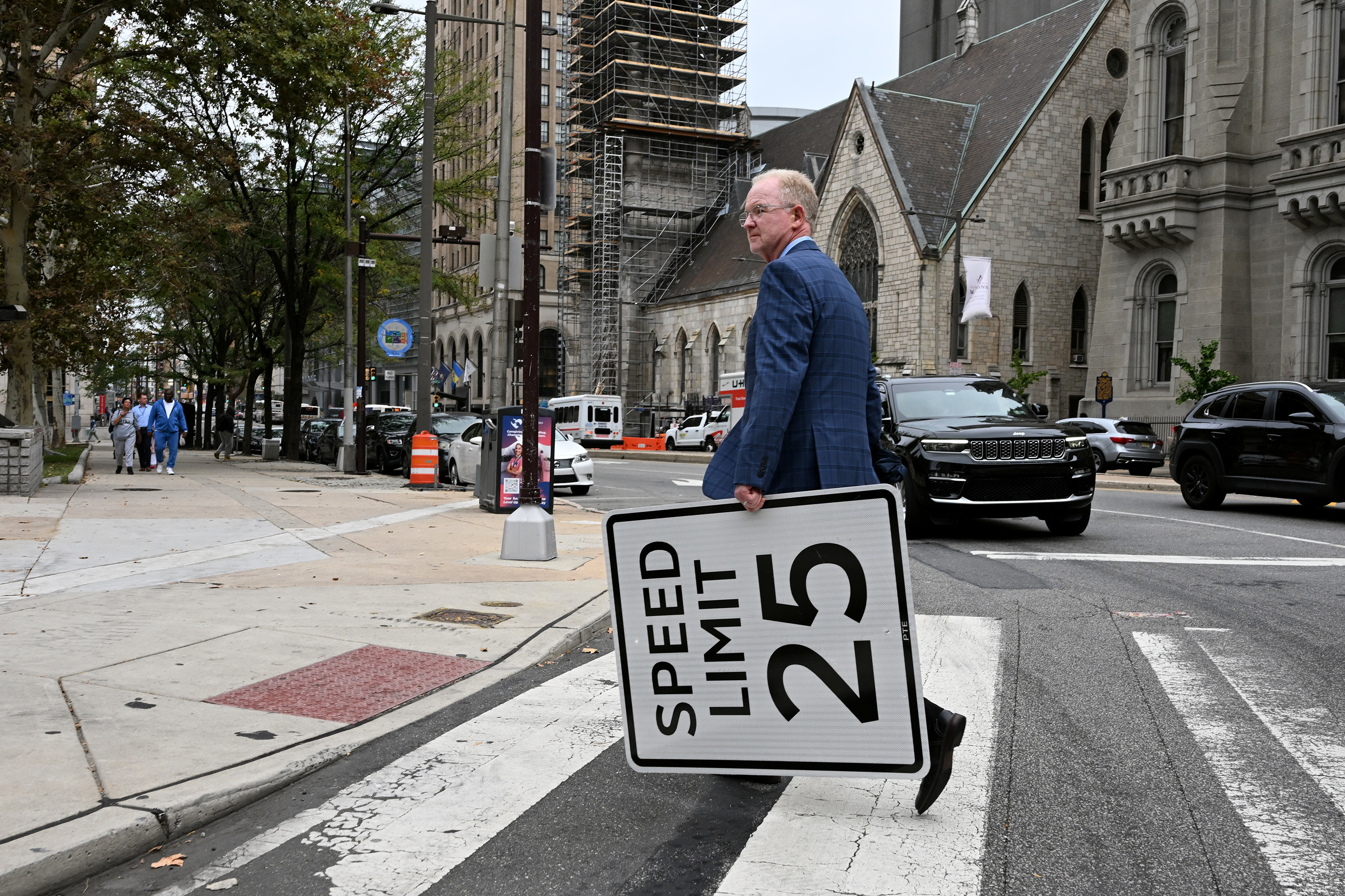 Dec. 29, 2025: Canada geese at sunrise in Evans Pond in Haddonfield, during the week of the Winter Solstice for the Northern Hemisphere. December 22, 2025: SEPTA trolley operator Victoria Daniels approaches the end of the Center City Tunnel, heading toward the 40th Street trolley portal after a tour to update the news media on overhead wire repairs in the closed tunnel due to unexpected issues from new slider parts.December 15, 2025: A historical interpreter waits at the parking garage elevators headed not to a December crossing of the Delaware River, but an event at the National Constitution Center. General George Washington was on his way to an unveiling of the U.S. Mint’s new 2026 coins for the Semiquincentennial, December 8, 2025: The Benjamin Franklin Bridge and pedestrians on the Delaware River Trail are reflected in mirrored spheres of the “Weaver’s Knot: Sheet Bend” public artwork on Columbus Boulevard. The site-specific stainless steel piece located between the Cherry Street and Race Street Piers was commissioned by the City’s Public Art Office and the Delaware River Waterfront Corporation and created and installed in 2022 by the design and fabrication group Ball-Nogues Studio. The name recalls a history that dominated the region for hundreds of years. “Weaver’s knot” derives from use in textile mills and the “Sheet bend” or “sheet knot” was used on sailing vessels for bending ropes to sails. November 29, 2025: t’s ginkgo time in our region again when the distinctive fan-shaped leaves turn yellow and then, on one day, lose all their leaves at the same time laying a carpet on city streets and sidewalks. A squirrel leaps over leaves in the 18th Century Garden in Independence National Historical Park Nov. 25, 2025. The ginkgo (Ginkgo biloba) is considered a living fossil as it’s the only surviving species of a group of trees that existed before dinosaurs. Genetically, it has remained unchanged over the past 200 million years. William Hamilton, owner the Woodlands in SW Phila (no relation to Alexander Hamilton) brought the first ginkgo trees to North America in 1785.November 24, 2025: The old waiting room at 30th Street Station that most people only pass through on their way to the restrooms has been spiffed up with benches – and a Christmas tree. It was placed there this year in front of the 30-foot frieze, “The Spirit of Transportation” while the lobby of Amtrak’s $550 million station restoration is underway. The 1895 relief sculpture by Karl Bitter was originally hung in the Broad Street Station by City Hall, but was moved in 1933. It depicts travel from ancient to modern and even futuristic times. November 17, 2025: Students on a field trip from the Christian Academy in Brookhaven, Delaware County, pose for a group photo in front of the Liberty Bell in Independence National Historical Park on Thursday. The trip was planned weeks earlier, before they knew it would be on the day park buildings were reopening after the government shutdown ended. “We got so lucky,” a teacher said. Then corrected herself. “It’s because we prayed for it.” November 8, 2025: Multitasking during the Festival de Día de Muertos – Day of the Dead – in South Philadelphia.November 1, 2025: Marcy Boroff is at City Hall dressed as a Coke can, along with preschoolers and their caregivers, in support of former Mayor Jim Kenney’s 2017 tax on sweetened beverages. City Council is considering repealing the tax, which funds the city’s pre-K programs. October 25, 2025: Austin Gabauer, paint and production assistant at the Johnson Atelier, in Hamilton Twp, N.J. as the finished “O” letter awaits the return to Philadelphia. The “Y” part of the OY/YO sculpture is inside the painting booth. The well-known sculpture outside the Weitzman National Museum of American Jewish History was removed in May while construction continues on Market Street and has been undergoing refurbishment at the Atelier at the Grounds for Sculpture outside of Trenton.October 20, 2025:The yellow shipping container next to City Hall attracted a line of over 300 people that stretched around a corner of Dilworth Park. Bystanders wondered as they watched devotees reaching the front take their selfies inside a retro Philly diner-esque booth tableau. Followers on social media had been invited to “Climb on to immerse yourself in the worlds of Pleasing Fragrance, Big Lip, and exclusive treasures,” including a spin of the “Freebie Wheel,” for products of the unisex lifestyle brand Pleasing, created by former One Direction singer Harry Styles.October 11, 2025: Can you find the Phillie Phanatic, as he leaves a “Rally for Red October Bus Tour” stop in downtown Westmont, N.J. just before the start of the NLDS? There’s always next year and he’ll be back. The 2026 Spring Training schedule has yet to be announced by Major League Baseball, but Phillies pitchers and catchers generally first report to Clearwater, Florida in mid-February.October 6. 2025: Fluorescent orange safety cone, 28 in, Poly Ethylene. Right: Paint Torch (detail) Claes Oldenburg, 2011, Steel, Fiberglass Reinforced Plastic, Gelcoat and Polyurethane. (Gob of paint, 6 ft. Main sculpture, 51 ft.). Lenfest Plaza at the Pennsylvania Academy of the Fine Arts on North Broad Street, across from the Convention Center.September 29, 2025: A concerned resident who follows Bucks County politics, Kevin Puls records the scene before a campaign rally for State Treasurer Stacy Garrity, the GOP candidate for governor. His T-shirt is “personal clickbait” with a url to direct people to the website for The Travis Manion Foundation created to empower veterans and families of fallen heroes. The image on the shirts is of Greg Stocker, one of the hosts of Kayal and Company, “A fun and entertaining conservative spin on Politics, News, and Sports,” mornings on Talk Radio 1210 WPHT.