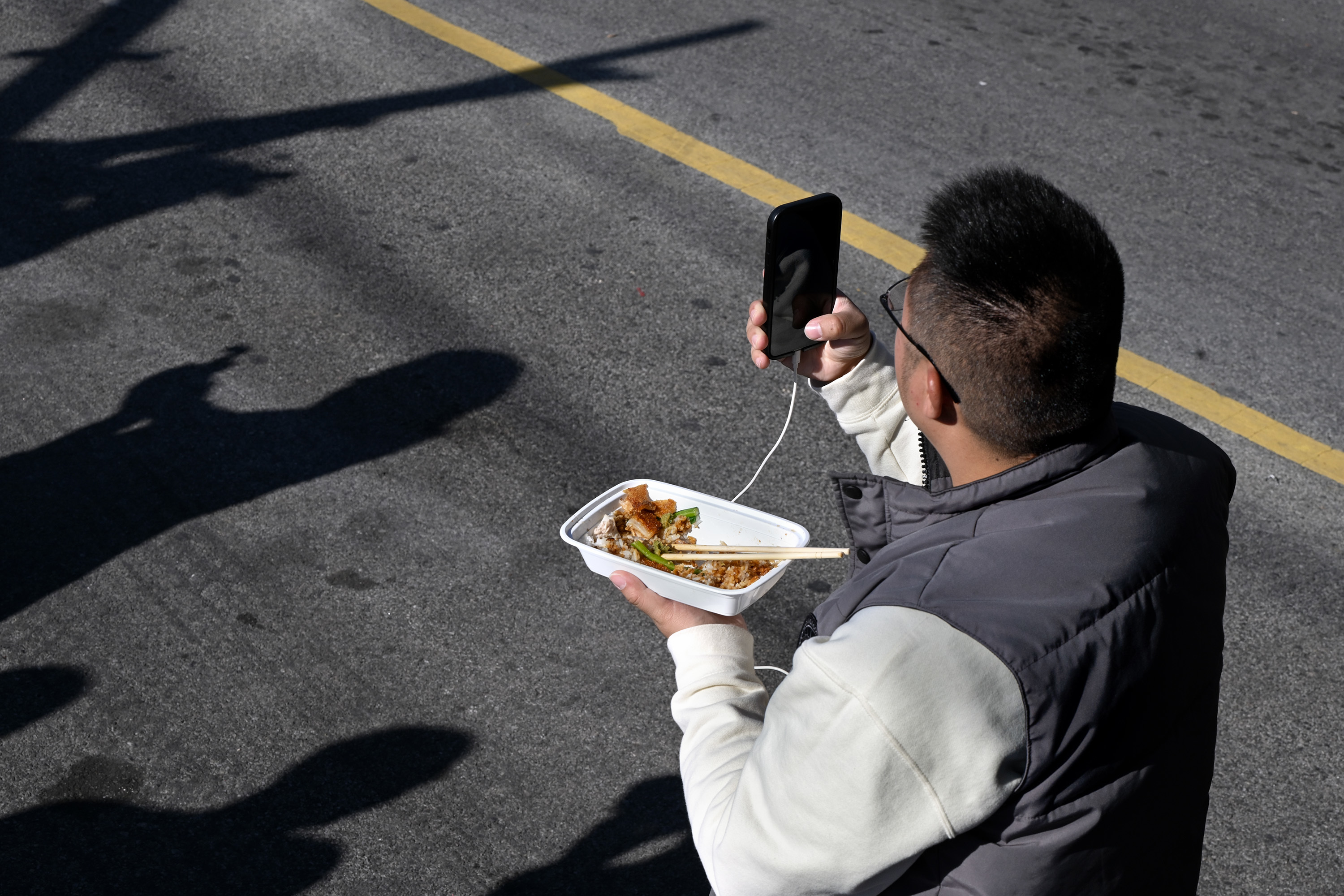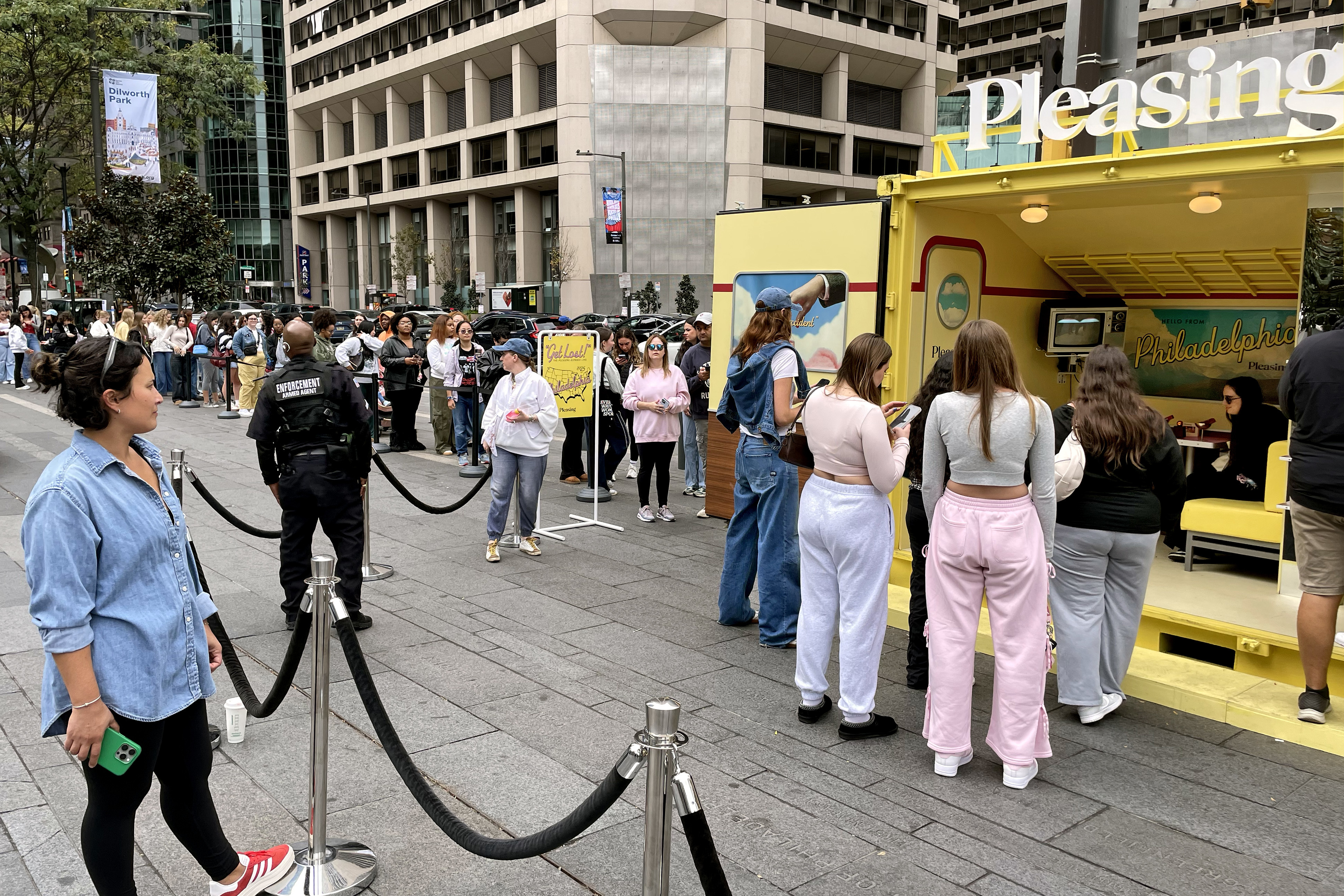 December 15, 2025: A historical interpreter waits at the parking garage elevators headed not to a December crossing of the Delaware River, but an event at the National Constitution Center. General George Washington was on his way to an unveiling of the U.S. Mint’s new 2026 coins for the Semiquincentennial, December 8, 2025: The Benjamin Franklin Bridge and pedestrians on the Delaware River Trail are reflected in mirrored spheres of the “Weaver’s Knot: Sheet Bend” public artwork on Columbus Boulevard. The site-specific stainless steel piece located between the Cherry Street and Race Street Piers was commissioned by the City’s Public Art Office and the Delaware River Waterfront Corporation and created and installed in 2022 by the design and fabrication group Ball-Nogues Studio. The name recalls a history that dominated the region for hundreds of years. “Weaver’s knot” derives from use in textile mills and the “Sheet bend” or “sheet knot” was used on sailing vessels for bending ropes to sails. November 29, 2025: t’s ginkgo time in our region again when the distinctive fan-shaped leaves turn yellow and then, on one day, lose all their leaves at the same time laying a carpet on city streets and sidewalks. A squirrel leaps over leaves in the 18th Century Garden in Independence National Historical Park Nov. 25, 2025. The ginkgo (Ginkgo biloba) is considered a living fossil as it’s the only surviving species of a group of trees that existed before dinosaurs. Genetically, it has remained unchanged over the past 200 million years. William Hamilton, owner the Woodlands in SW Phila (no relation to Alexander Hamilton) brought the first ginkgo trees to North America in 1785.November 24, 2025: The old waiting room at 30th Street Station that most people only pass through on their way to the restrooms has been spiffed up with benches – and a Christmas tree. It was placed there this year in front of the 30-foot frieze, “The Spirit of Transportation” while the lobby of Amtrak’s $550 million station restoration is underway. The 1895 relief sculpture by Karl Bitter was originally hung in the Broad Street Station by City Hall, but was moved in 1933. It depicts travel from ancient to modern and even futuristic times. November 17, 2025: Students on a field trip from the Christian Academy in Brookhaven, Delaware County, pose for a group photo in front of the Liberty Bell in Independence National Historical Park on Thursday. The trip was planned weeks earlier, before they knew it would be on the day park buildings were reopening after the government shutdown ended. “We got so lucky,” a teacher said. Then corrected herself. “It’s because we prayed for it.” November 8, 2025: Multitasking during the Festival de Día de Muertos – Day of the Dead – in South Philadelphia.November 1, 2025: Marcy Boroff is at City Hall dressed as a Coke can, along with preschoolers and their caregivers, in support of former Mayor Jim Kenney’s 2017 tax on sweetened beverages. City Council is considering repealing the tax, which funds the city’s pre-K programs. October 25, 2025: Austin Gabauer, paint and production assistant at the Johnson Atelier, in Hamilton Twp, N.J. as the finished “O” letter awaits the return to Philadelphia. The “Y” part of the OY/YO sculpture is inside the painting booth. The well-known sculpture outside the Weitzman National Museum of American Jewish History was removed in May while construction continues on Market Street and has been undergoing refurbishment at the Atelier at the Grounds for Sculpture outside of Trenton.October 20, 2025:The yellow shipping container next to City Hall attracted a line of over 300 people that stretched around a corner of Dilworth Park. Bystanders wondered as they watched devotees reaching the front take their selfies inside a retro Philly diner-esque booth tableau. Followers on social media had been invited to “Climb on to immerse yourself in the worlds of Pleasing Fragrance, Big Lip, and exclusive treasures,” including a spin of the “Freebie Wheel,” for products of the unisex lifestyle brand Pleasing, created by former One Direction singer Harry Styles.October 11, 2025: Can you find the Phillie Phanatic, as he leaves a “Rally for Red October Bus Tour” stop in downtown Westmont, N.J. just before the start of the NLDS? There’s always next year and he’ll be back. The 2026 Spring Training schedule has yet to be announced by Major League Baseball, but Phillies pitchers and catchers generally first report to Clearwater, Florida in mid-February.October 6. 2025: Fluorescent orange safety cone, 28 in, Poly Ethylene. Right: Paint Torch (detail) Claes Oldenburg, 2011, Steel, Fiberglass Reinforced Plastic, Gelcoat and Polyurethane. (Gob of paint, 6 ft. Main sculpture, 51 ft.). Lenfest Plaza at the Pennsylvania Academy of the Fine Arts on North Broad Street, across from the Convention Center.September 29, 2025: A concerned resident who follows Bucks County politics, Kevin Puls records the scene before a campaign rally for State Treasurer Stacy Garrity, the GOP candidate for governor. His T-shirt is “personal clickbait” with a url to direct people to the website for The Travis Manion Foundation created to empower veterans and families of fallen heroes. The image on the shirts is of Greg Stocker, one of the hosts of Kayal and Company, “A fun and entertaining conservative spin on Politics, News, and Sports,” mornings on Talk Radio 1210 WPHT.September 22, 2025: A shadow is cast by “The Cock’s Comb,” created by Alexander “Sandy” Calder in 1960, is the first work seen by visitors arriving at Calder Gardens, the new sanctuary on the Ben Franklin Parkway. The indoor and outdoor spaces feature the mobiles, stabiles, and paintings of Calder, who was born in Philadelphia in 1898, the third generation of the family’s artistic legacy in the city.September 15, 2025: Department of Streets Director of Operations 
