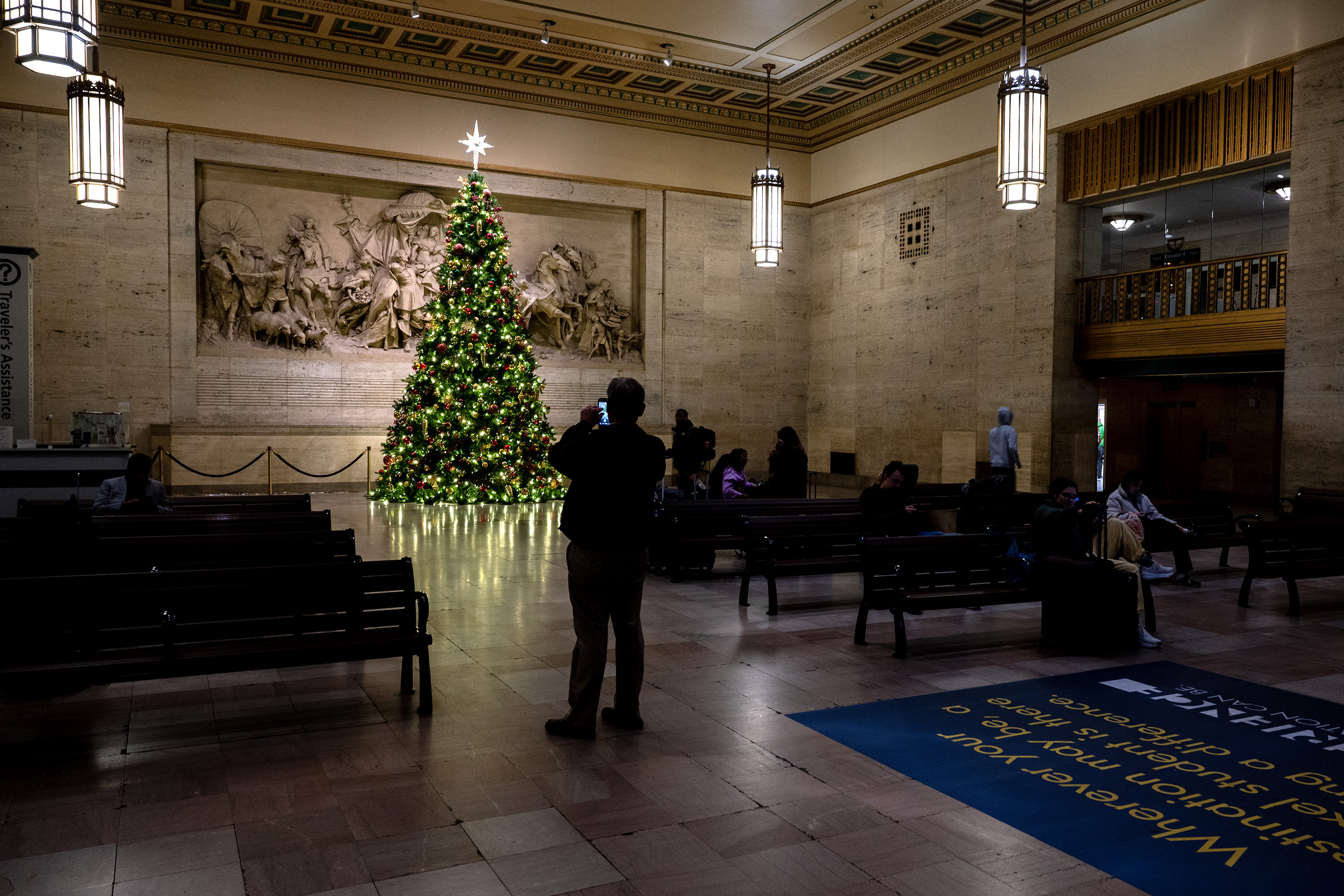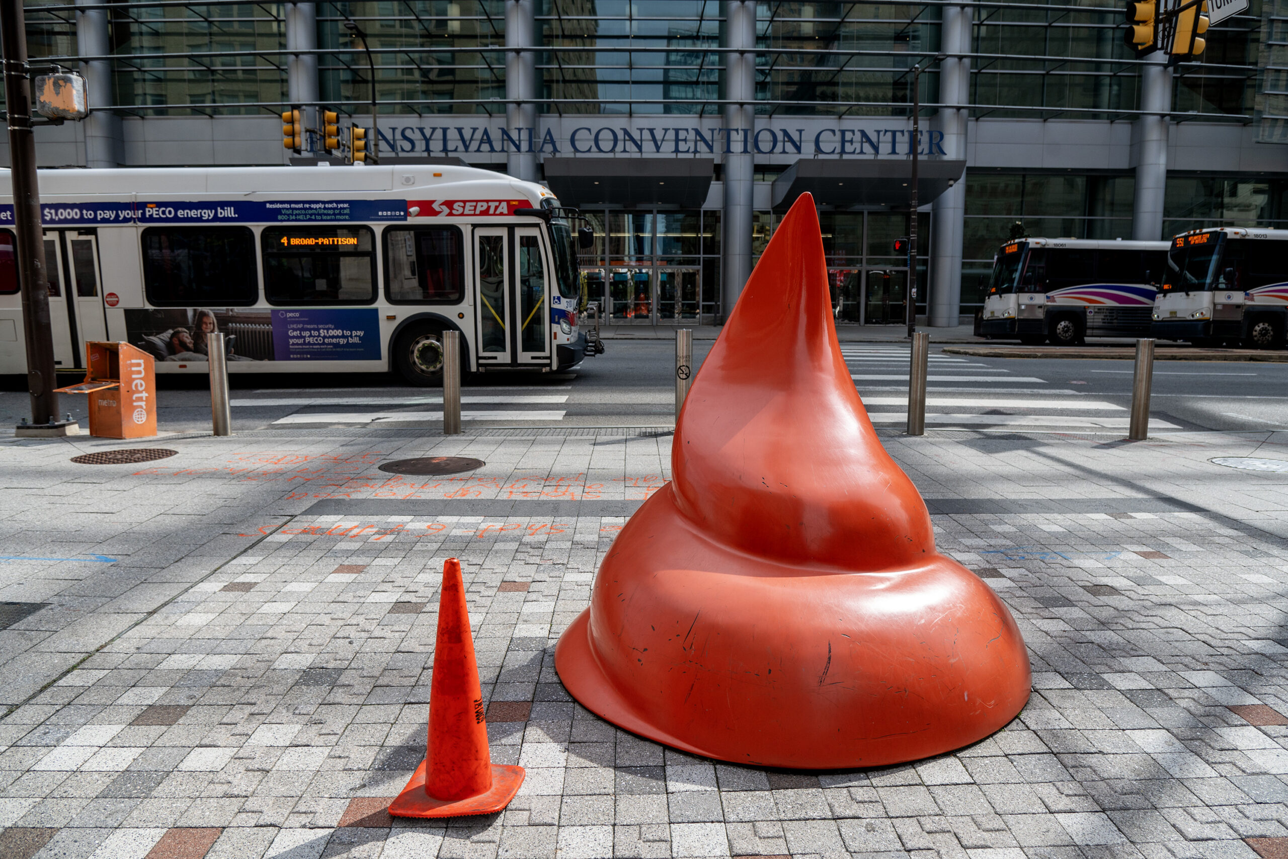 December 22, 2025: SEPTA trolley operator Victoria Daniels approaches the end of the Center City Tunnel, heading toward the 40th Street trolley portal after a tour to update the news media on overhead wire repairs in the closed tunnel due to unexpected issues from new slider parts.December 15, 2025: A historical interpreter waits at the parking garage elevators headed not to a December crossing of the Delaware River, but an event at the National Constitution Center. General George Washington was on his way to an unveiling of the U.S. Mint’s new 2026 coins for the Semiquincentennial, December 8, 2025: The Benjamin Franklin Bridge and pedestrians on the Delaware River Trail are reflected in mirrored spheres of the “Weaver’s Knot: Sheet Bend” public artwork on Columbus Boulevard. The site-specific stainless steel piece located between the Cherry Street and Race Street Piers was commissioned by the City’s Public Art Office and the Delaware River Waterfront Corporation and created and installed in 2022 by the design and fabrication group Ball-Nogues Studio. The name recalls a history that dominated the region for hundreds of years. “Weaver’s knot” derives from use in textile mills and the “Sheet bend” or “sheet knot” was used on sailing vessels for bending ropes to sails. November 29, 2025: t’s ginkgo time in our region again when the distinctive fan-shaped leaves turn yellow and then, on one day, lose all their leaves at the same time laying a carpet on city streets and sidewalks. A squirrel leaps over leaves in the 18th Century Garden in Independence National Historical Park Nov. 25, 2025. The ginkgo (Ginkgo biloba) is considered a living fossil as it’s the only surviving species of a group of trees that existed before dinosaurs. Genetically, it has remained unchanged over the past 200 million years. William Hamilton, owner the Woodlands in SW Phila (no relation to Alexander Hamilton) brought the first ginkgo trees to North America in 1785.November 24, 2025: The old waiting room at 30th Street Station that most people only pass through on their way to the restrooms has been spiffed up with benches – and a Christmas tree. It was placed there this year in front of the 30-foot frieze, “The Spirit of Transportation” while the lobby of Amtrak’s $550 million station restoration is underway. The 1895 relief sculpture by Karl Bitter was originally hung in the Broad Street Station by City Hall, but was moved in 1933. It depicts travel from ancient to modern and even futuristic times. November 17, 2025: Students on a field trip from the Christian Academy in Brookhaven, Delaware County, pose for a group photo in front of the Liberty Bell in Independence National Historical Park on Thursday. The trip was planned weeks earlier, before they knew it would be on the day park buildings were reopening after the government shutdown ended. “We got so lucky,” a teacher said. Then corrected herself. “It’s because we prayed for it.” November 8, 2025: Multitasking during the Festival de Día de Muertos – Day of the Dead – in South Philadelphia.November 1, 2025: Marcy Boroff is at City Hall dressed as a Coke can, along with preschoolers and their caregivers, in support of former Mayor Jim Kenney’s 2017 tax on sweetened beverages. City Council is considering repealing the tax, which funds the city’s pre-K programs. October 25, 2025: Austin Gabauer, paint and production assistant at the Johnson Atelier, in Hamilton Twp, N.J. as the finished “O” letter awaits the return to Philadelphia. The “Y” part of the OY/YO sculpture is inside the painting booth. The well-known sculpture outside the Weitzman National Museum of American Jewish History was removed in May while construction continues on Market Street and has been undergoing refurbishment at the Atelier at the Grounds for Sculpture outside of Trenton.October 20, 2025:The yellow shipping container next to City Hall attracted a line of over 300 people that stretched around a corner of Dilworth Park. Bystanders wondered as they watched devotees reaching the front take their selfies inside a retro Philly diner-esque booth tableau. Followers on social media had been invited to “Climb on to immerse yourself in the worlds of Pleasing Fragrance, Big Lip, and exclusive treasures,” including a spin of the “Freebie Wheel,” for products of the unisex lifestyle brand Pleasing, created by former One Direction singer Harry Styles.October 11, 2025: Can you find the Phillie Phanatic, as he leaves a “Rally for Red October Bus Tour” stop in downtown Westmont, N.J. just before the start of the NLDS? There’s always next year and he’ll be back. The 2026 Spring Training schedule has yet to be announced by Major League Baseball, but Phillies pitchers and catchers generally first report to Clearwater, Florida in mid-February.October 6. 2025: Fluorescent orange safety cone, 28 in, Poly Ethylene. Right: Paint Torch (detail) Claes Oldenburg, 2011, Steel, Fiberglass Reinforced Plastic, Gelcoat and Polyurethane. (Gob of paint, 6 ft. Main sculpture, 51 ft.). Lenfest Plaza at the Pennsylvania Academy of the Fine Arts on North Broad Street, across from the Convention Center.September 29, 2025: A concerned resident who follows Bucks County politics, Kevin Puls records the scene before a campaign rally for State Treasurer Stacy Garrity, the GOP candidate for governor. His T-shirt is “personal clickbait” with a url to direct people to the website for The Travis Manion Foundation created to empower veterans and families of fallen heroes. The image on the shirts is of Greg Stocker, one of the hosts of Kayal and Company, “A fun and entertaining conservative spin on Politics, News, and Sports,” mornings on Talk Radio 1210 WPHT.September 22, 2025: A shadow is cast by “The Cock’s Comb,” created by Alexander “Sandy” Calder in 1960, is the first work seen by visitors arriving at Calder Gardens, the new sanctuary on 