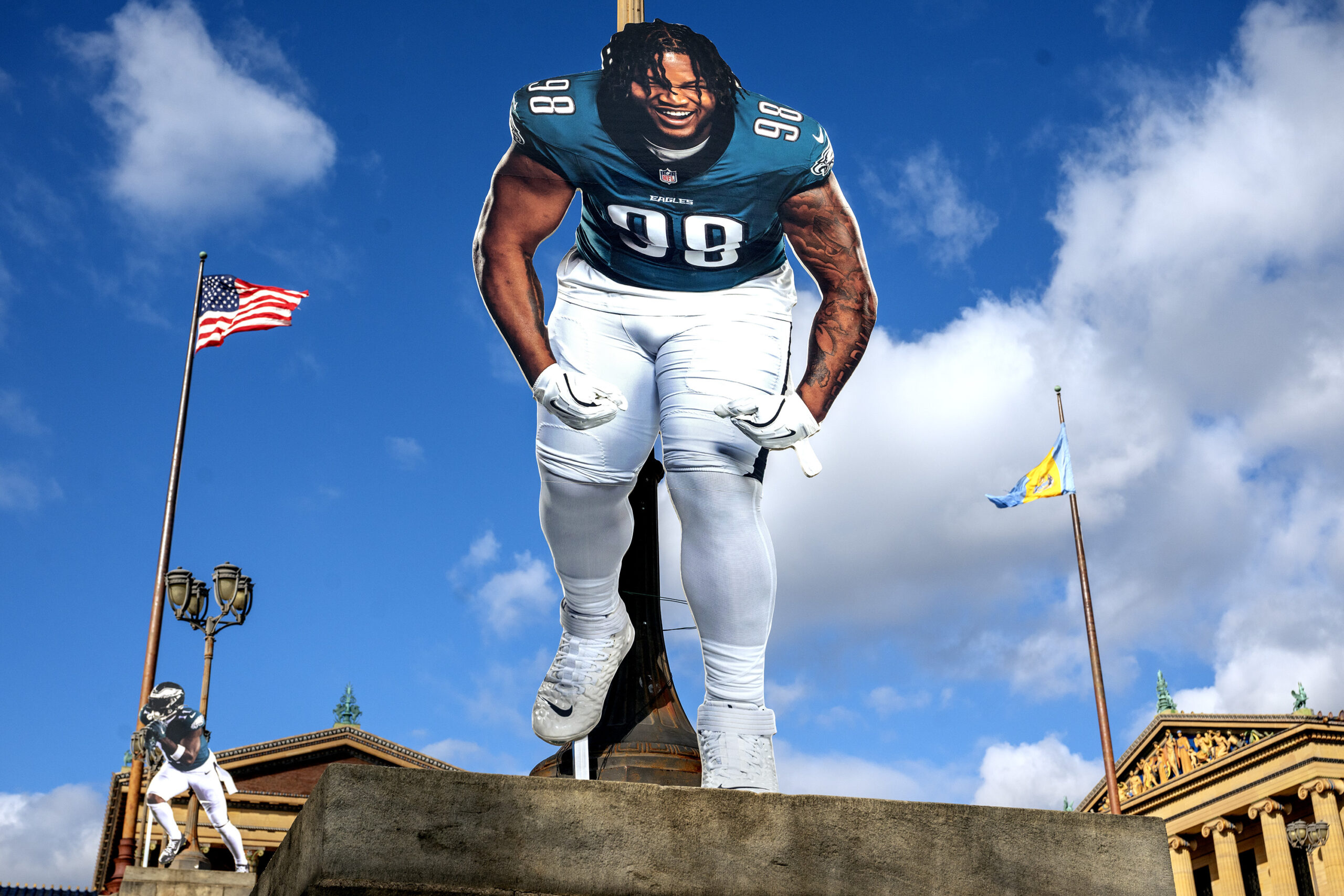 Ahead of Sunday’s wildcard playoff game against the San Francisco 49ers, the museum put up giant cutouts of four Eagles players on its iconic front steps. The cutouts first appeared in 2014 (before the Birds’ wild-card loss to the New Orleans Saints) and again a few times over the years, including before both Super Bowl wins in 2018 and last year.