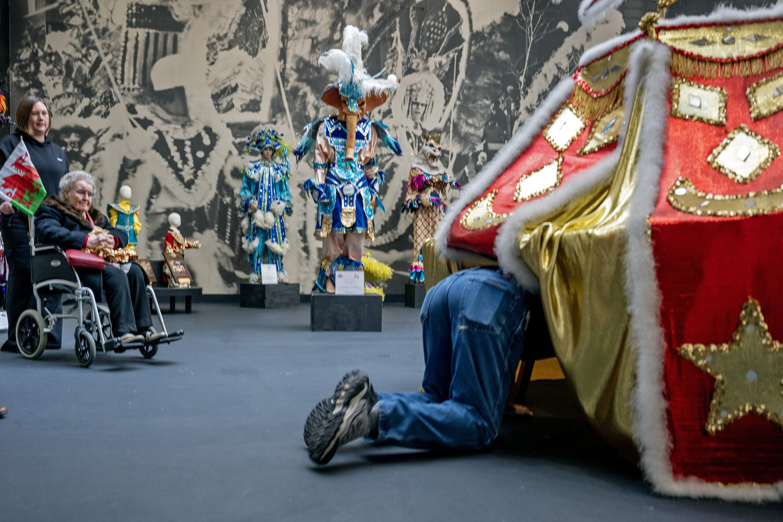 Mummers Museum president Brian Donnelly crawls inside to demonstrat marching in a large Fancy Division frame suit while giving Avril Davidge a tour.