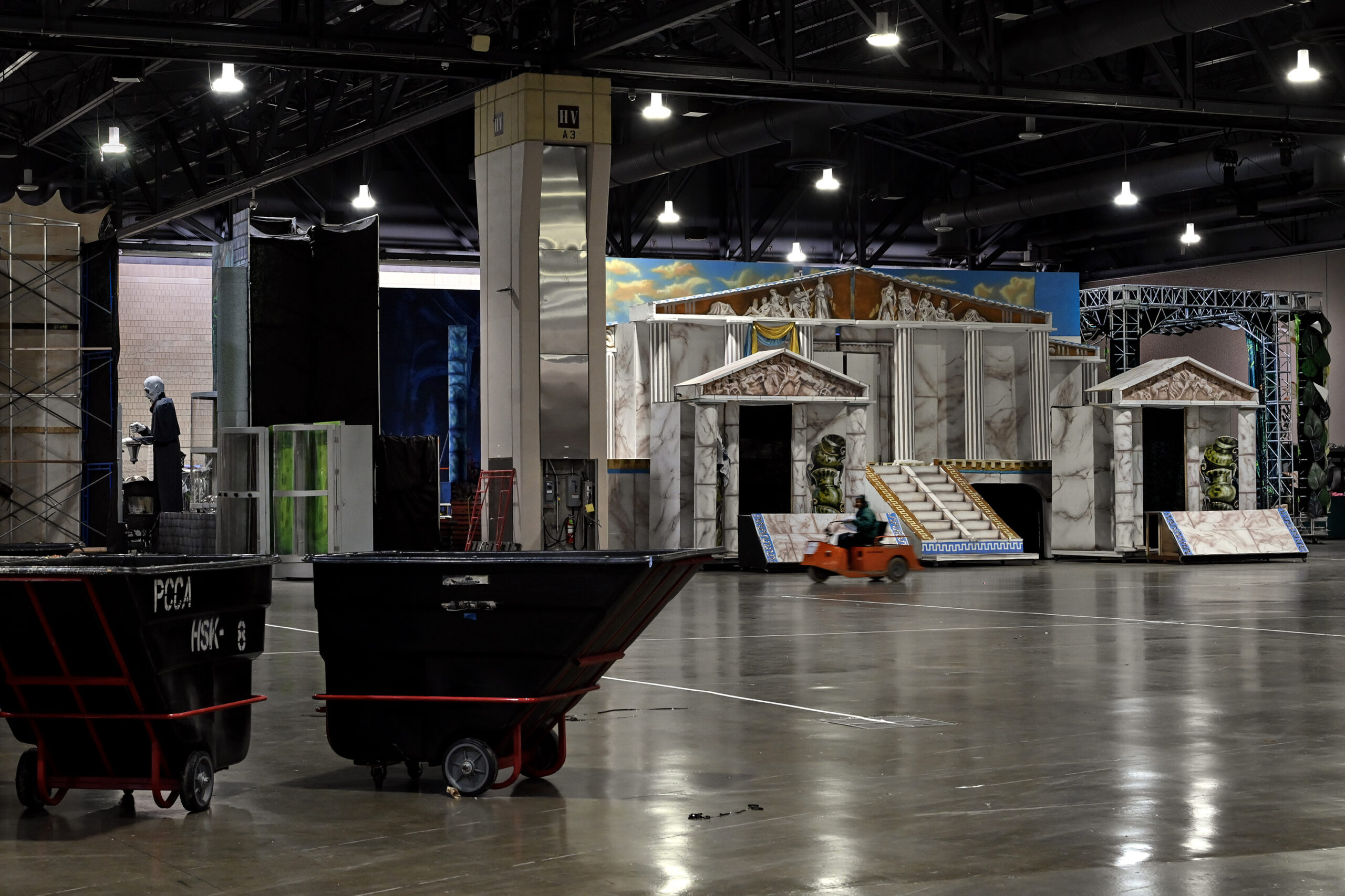 An empty Convention Center hours before Fancy Brigade members arrive for a night of finishing the construction of their stage sets.