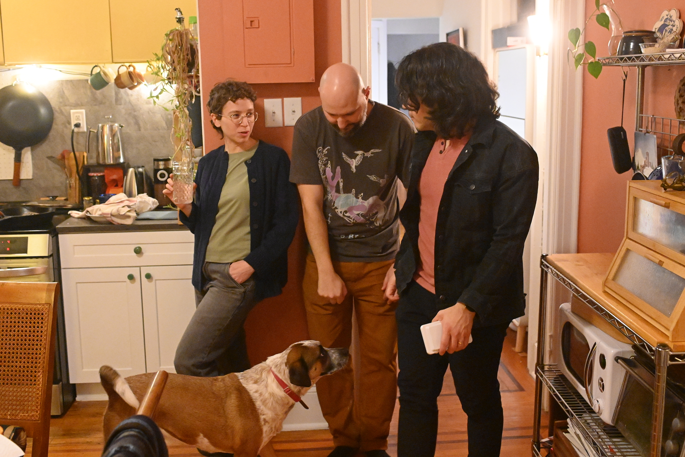 Rachel Luban, house friend Fadi Awadalla, and Serge Levin share a moment in the kitchen.