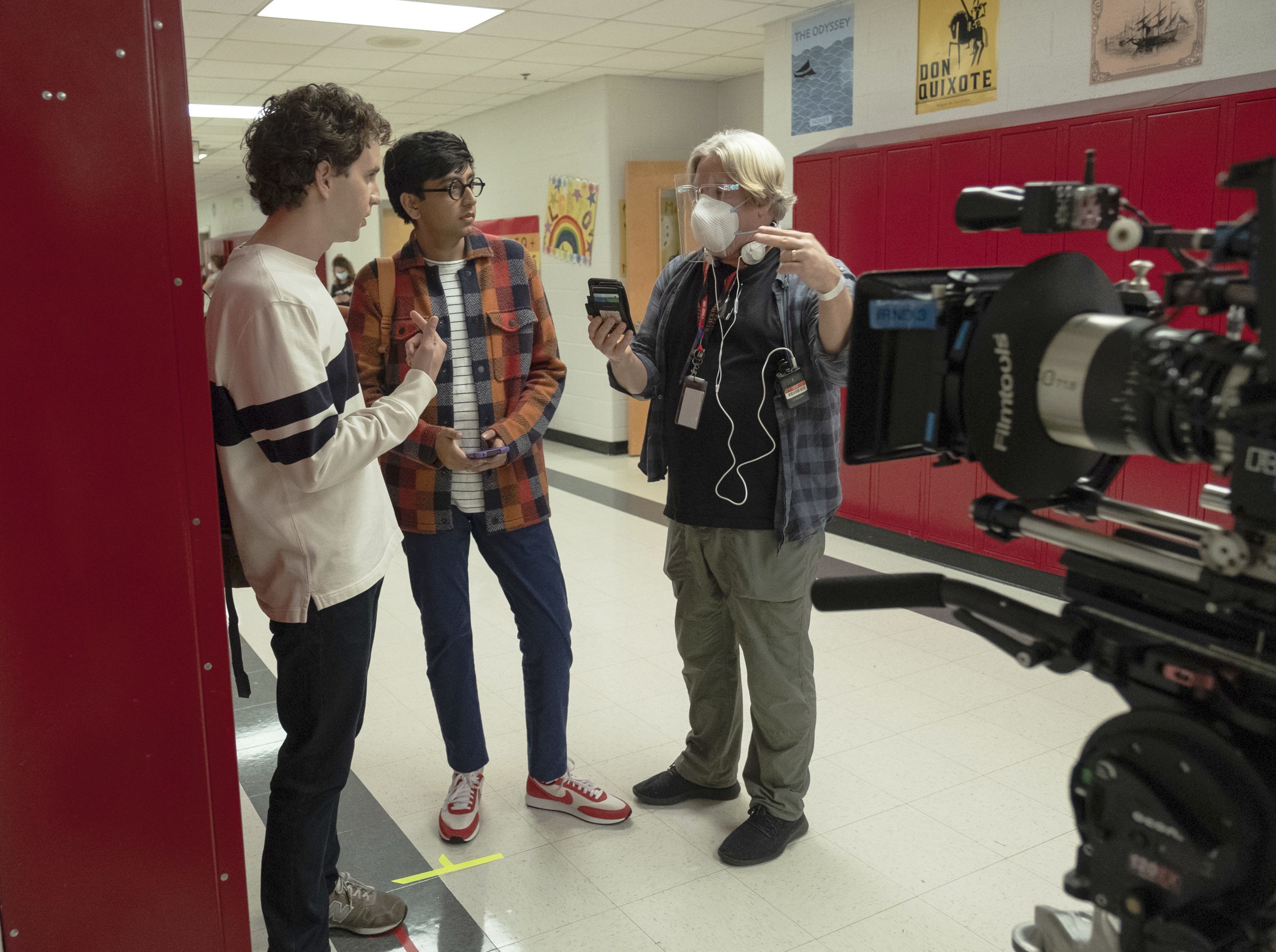 From left: Ben Platt, Nik Dodani, and director Stephen Chbosky on the set of “Dear Evan Hansen.”
