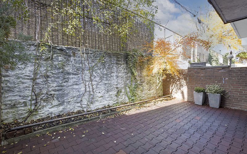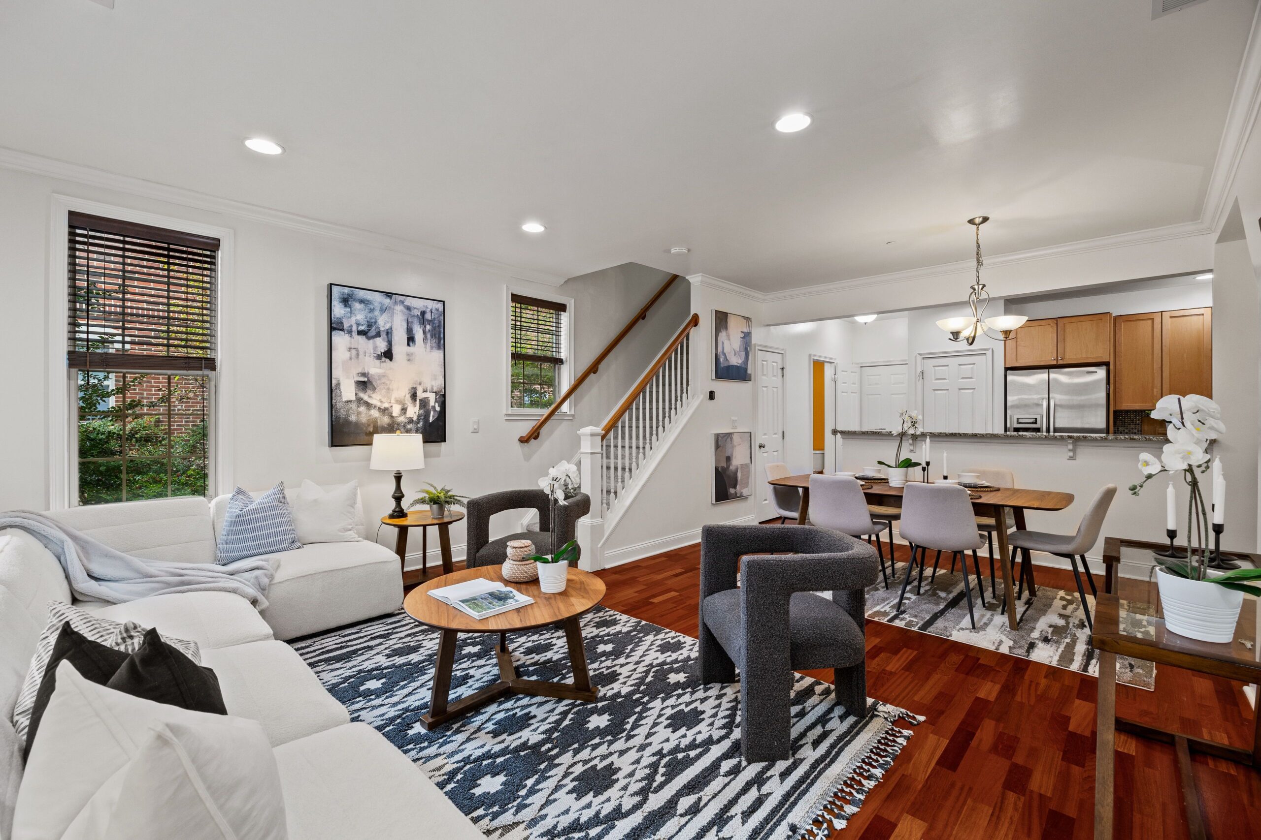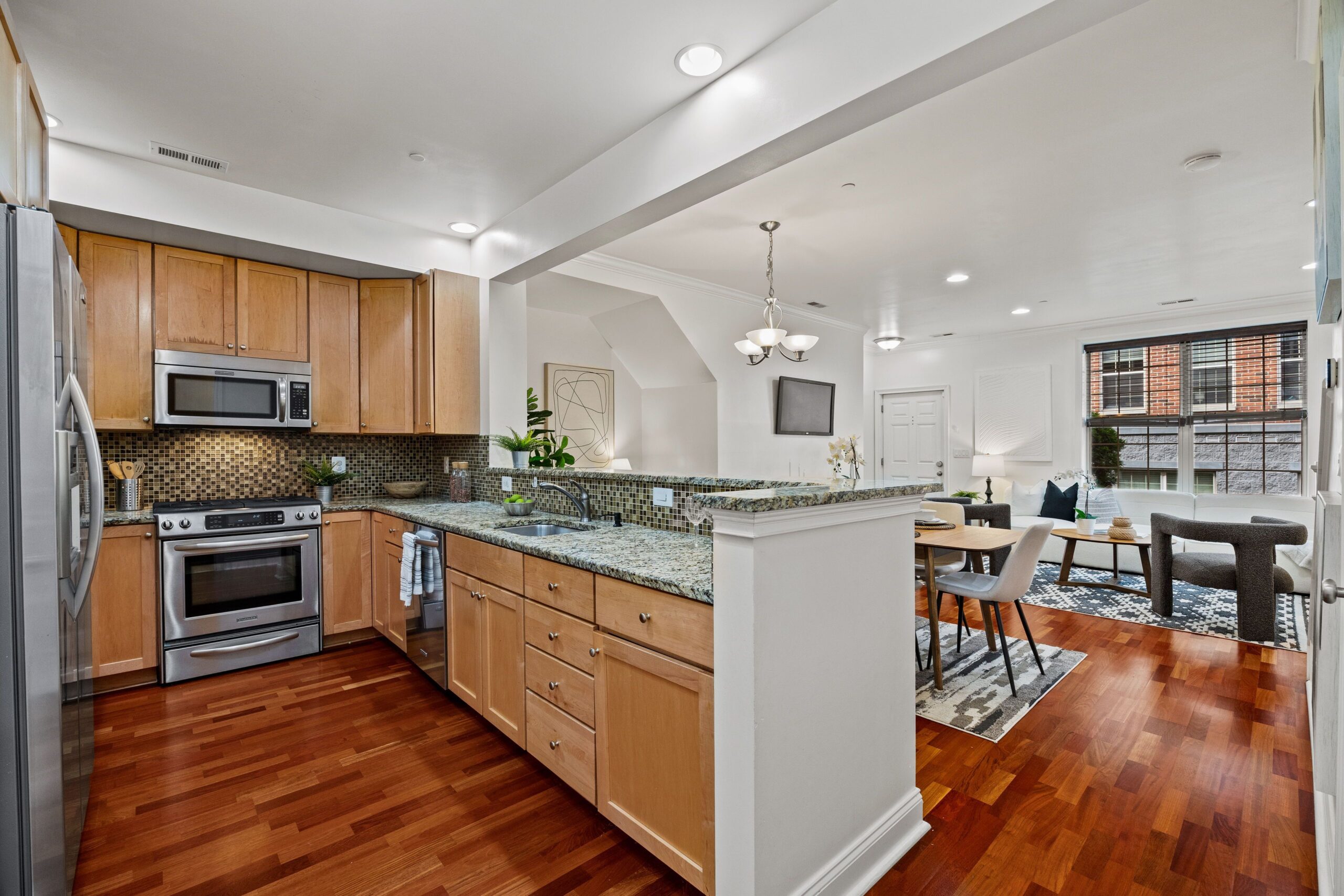 The unit features a private terrace spanning the width of the property. On the first level, it has an open-concept living and dining area and a kitchen with Shaker-style maple cabinetry, stone countertops, a glass tile backsplash, Brazilian cherry hardwood flooring, and a half bath.