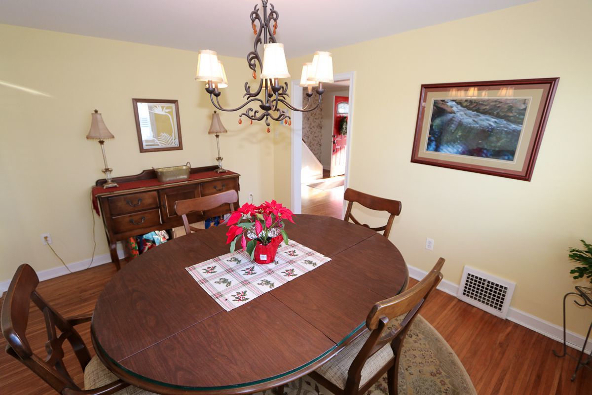 The dining room has a butler’s cabinet and a powder room with a pocket door.