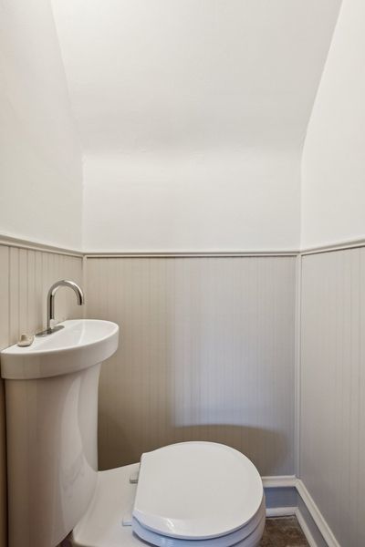 The hall bath has a stained-glass window and a laundry room, which has built-ins, closet space, and the home’s original porcelain sink hutch.