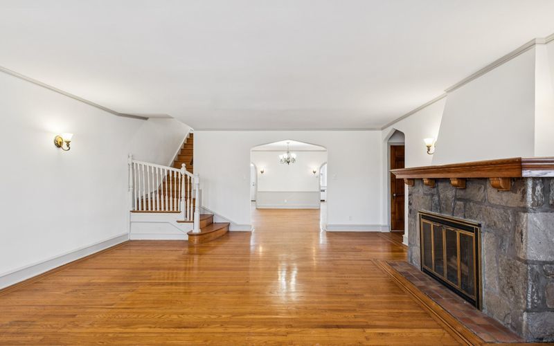 The main level has a large living room with hardwood floors, and the dining room has the original plaster detailing. Arched French doors lead into the kitchen, which has stained glass windows.