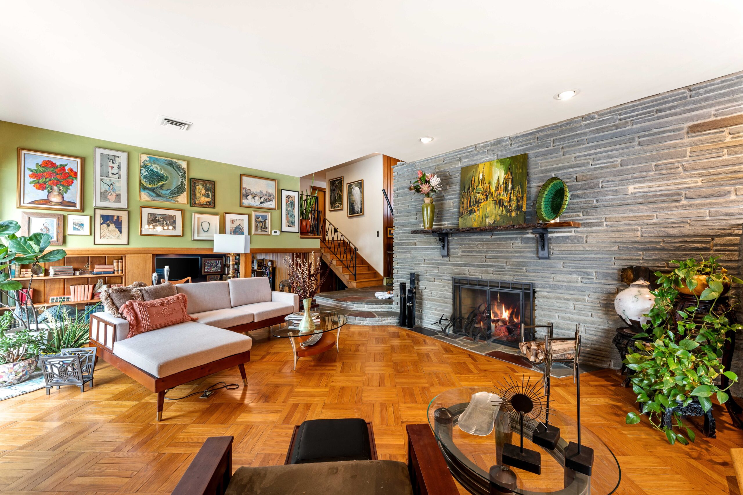 The home’s living room. There are working wood-burning fireplaces on the first level and in the basement.
