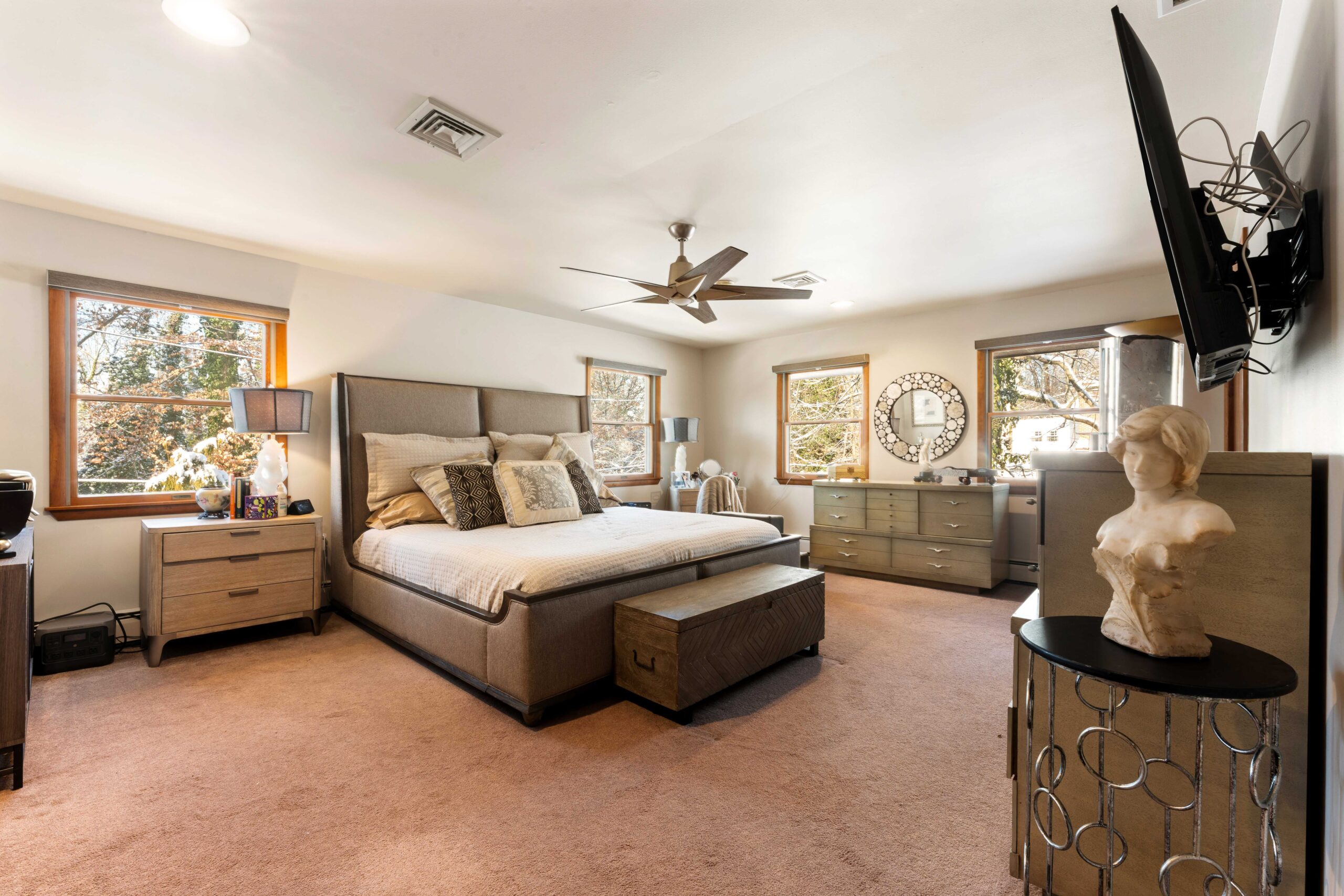 The upper level primary suite has vaulted ceilings and multiple closets.