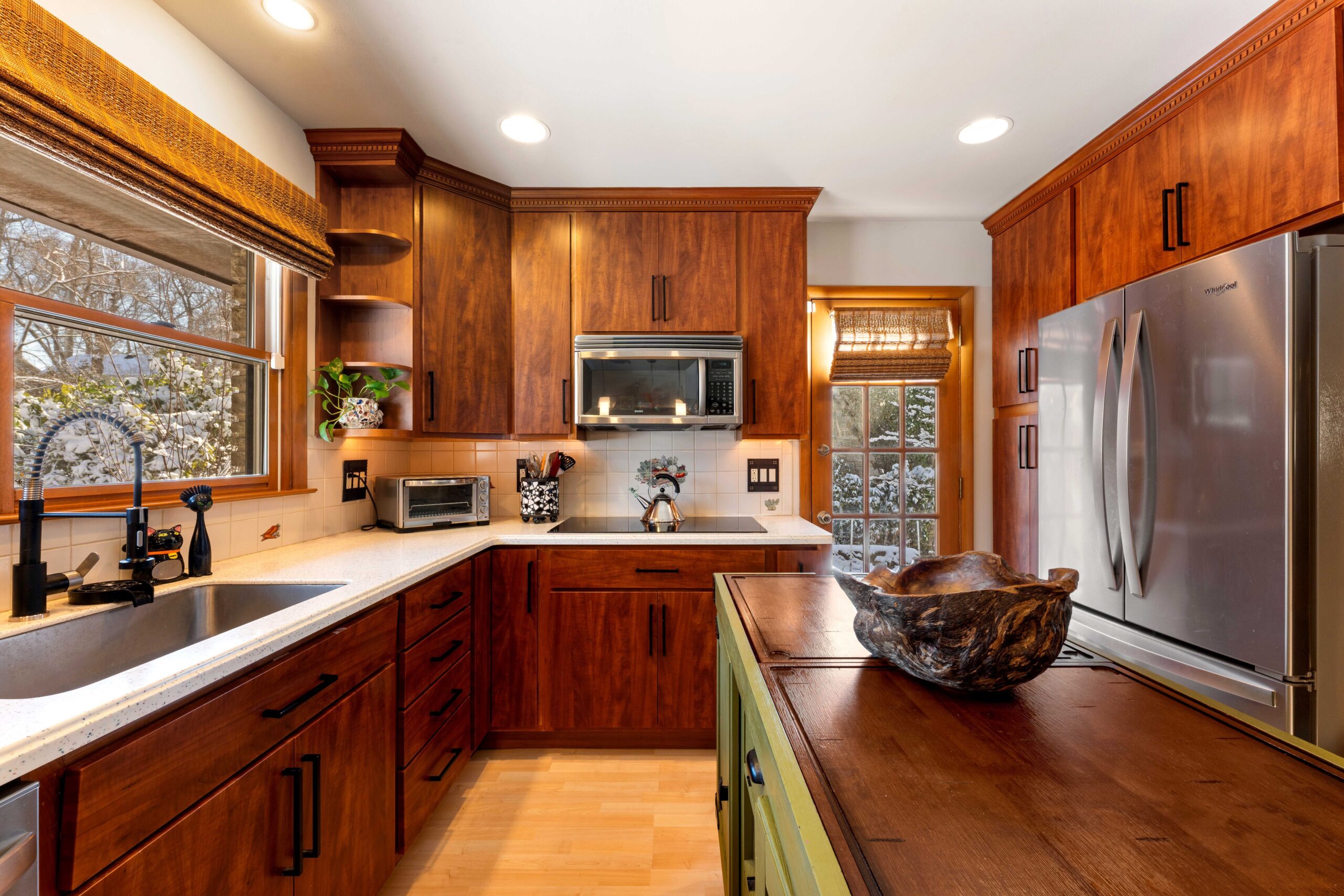 The refrigerator and gas range were reused. A new hood, dishwasher, and beverage refrigerator were added. The custom island — larger than its predecessor — is a stained cherry wood that was chosen to match the natural wood trim on the existing windows.